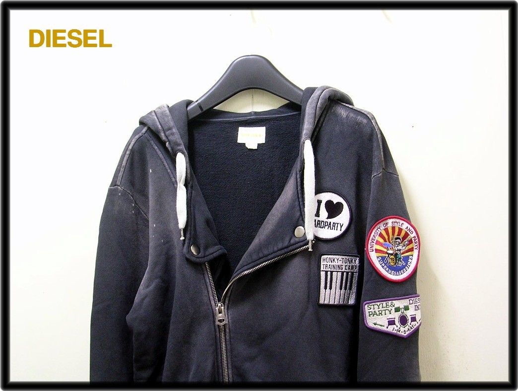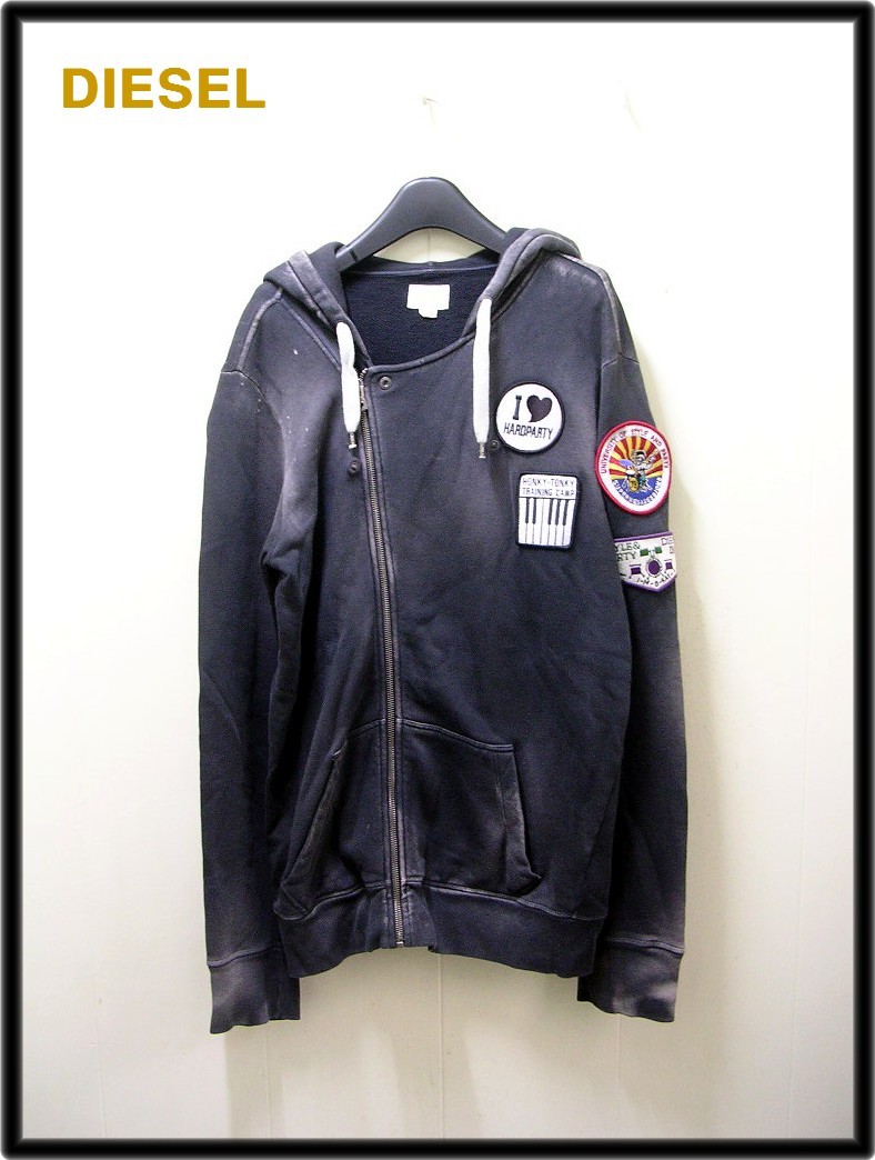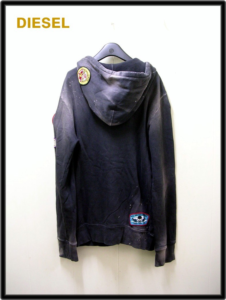M【DIESEL ディーゼル USED加工 ワッペン ライダースパーカー スウェットZipフード】
