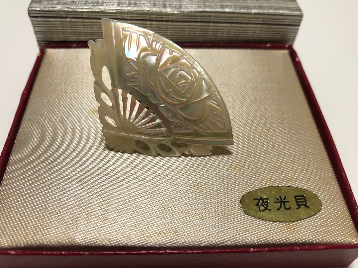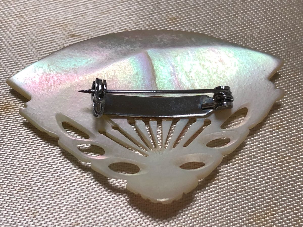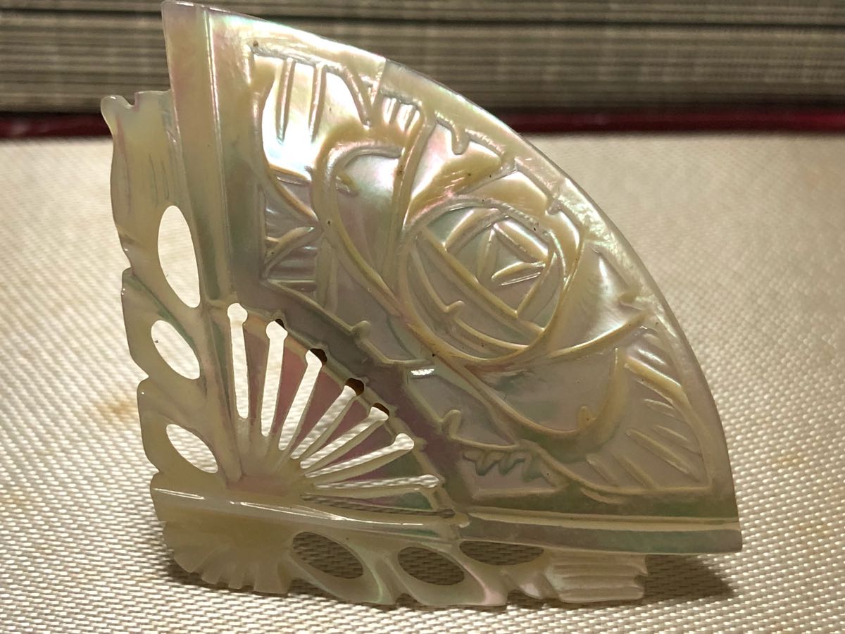 夜光貝を使用し、薔薇細工を施した、扇デザインのブローチです。美品、箱付属です。
