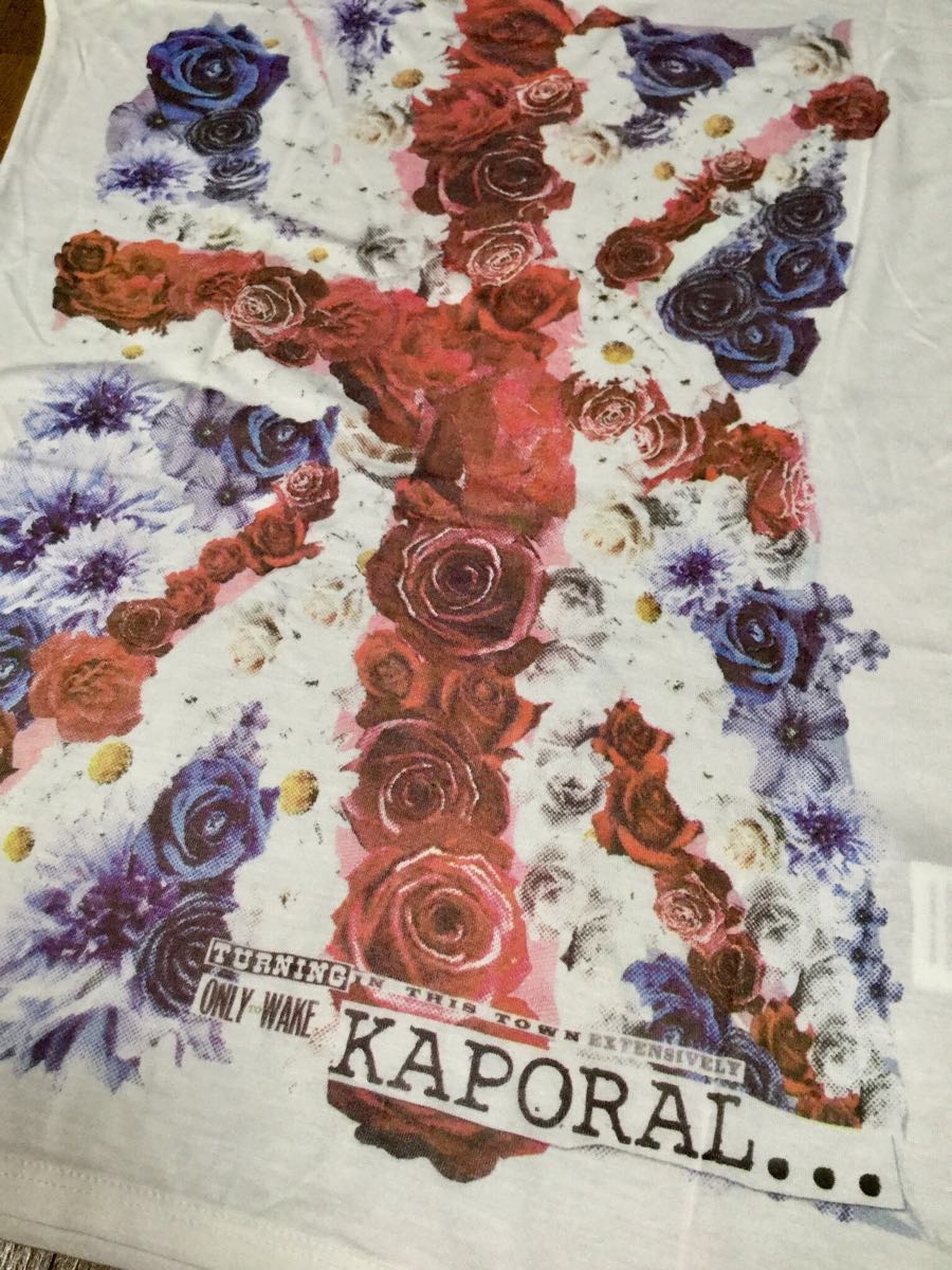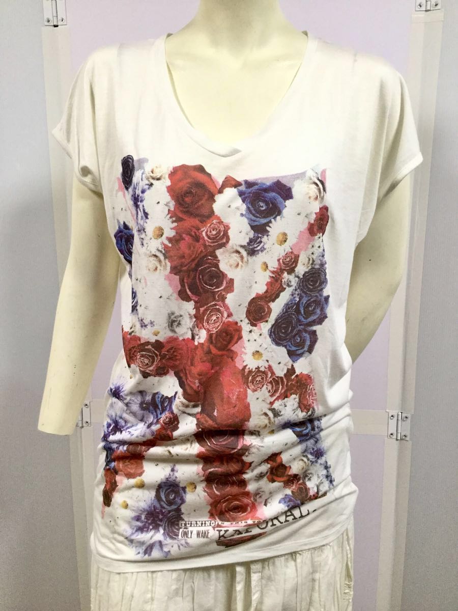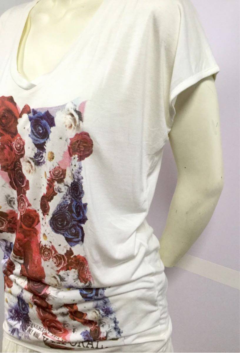 今回出品致しましたのは、フロントに大きく薔薇で描かれたユニオンジャック柄がインパクトあるプリントの施された、Vネックのトップスになります。