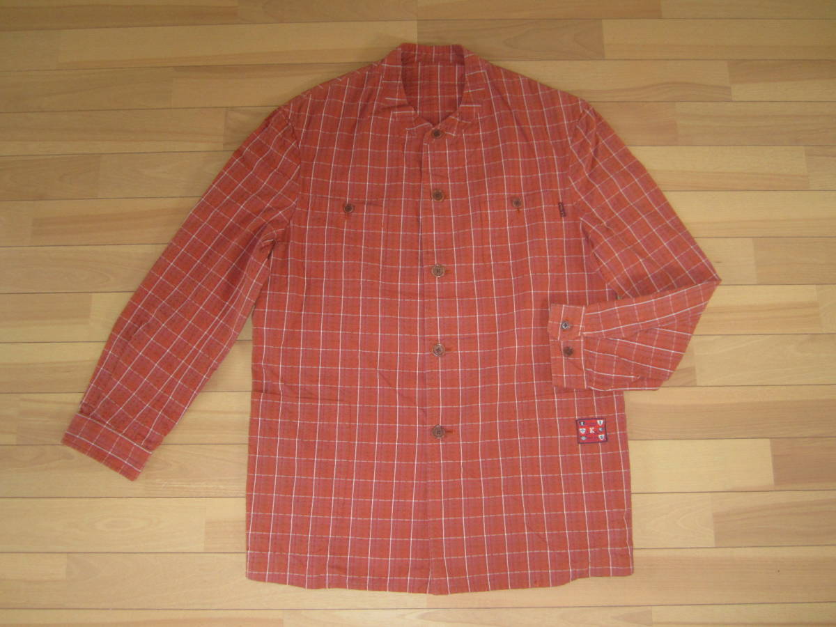 レンガ色ベースに白と画像では見にくいですがグレー系のチェックが入ってます。