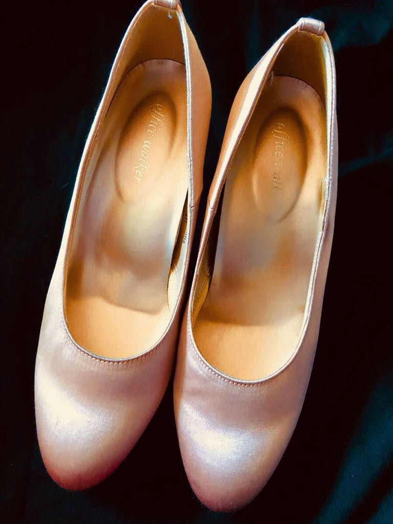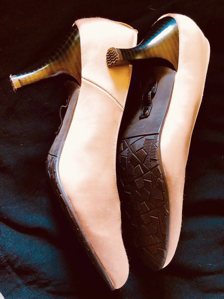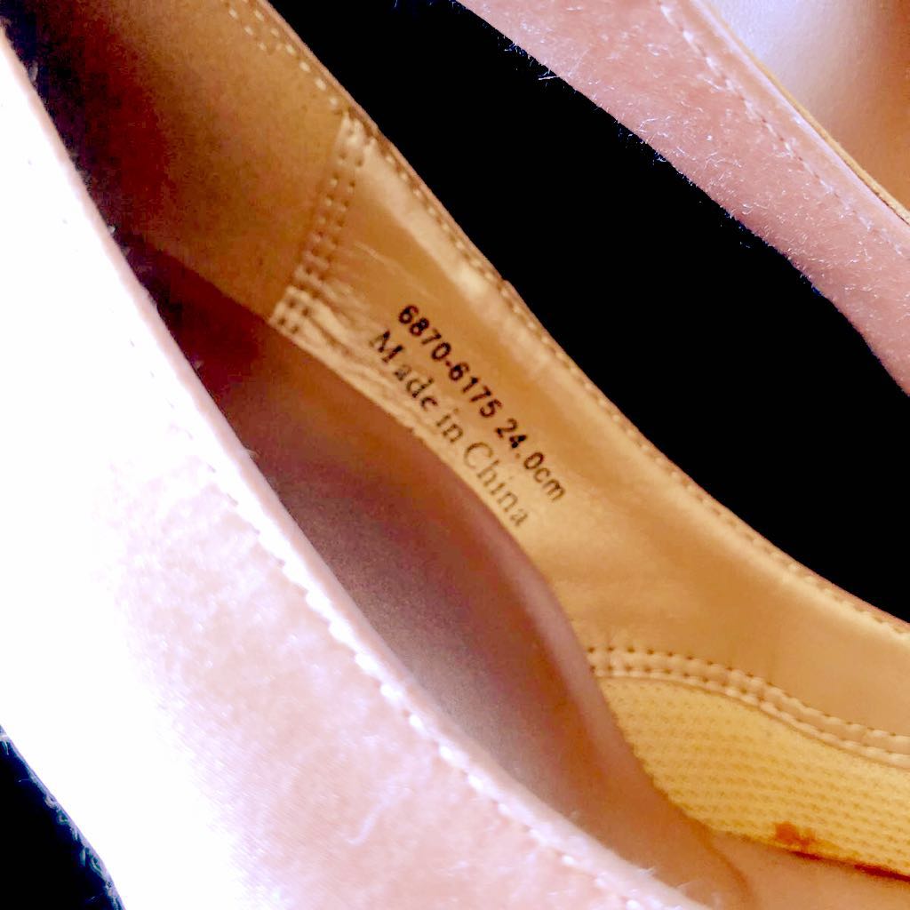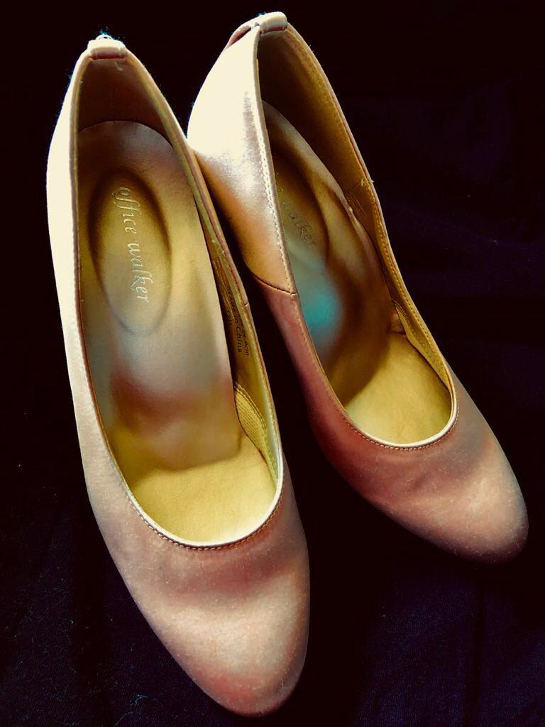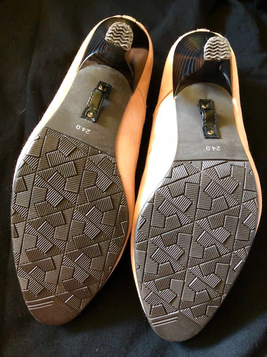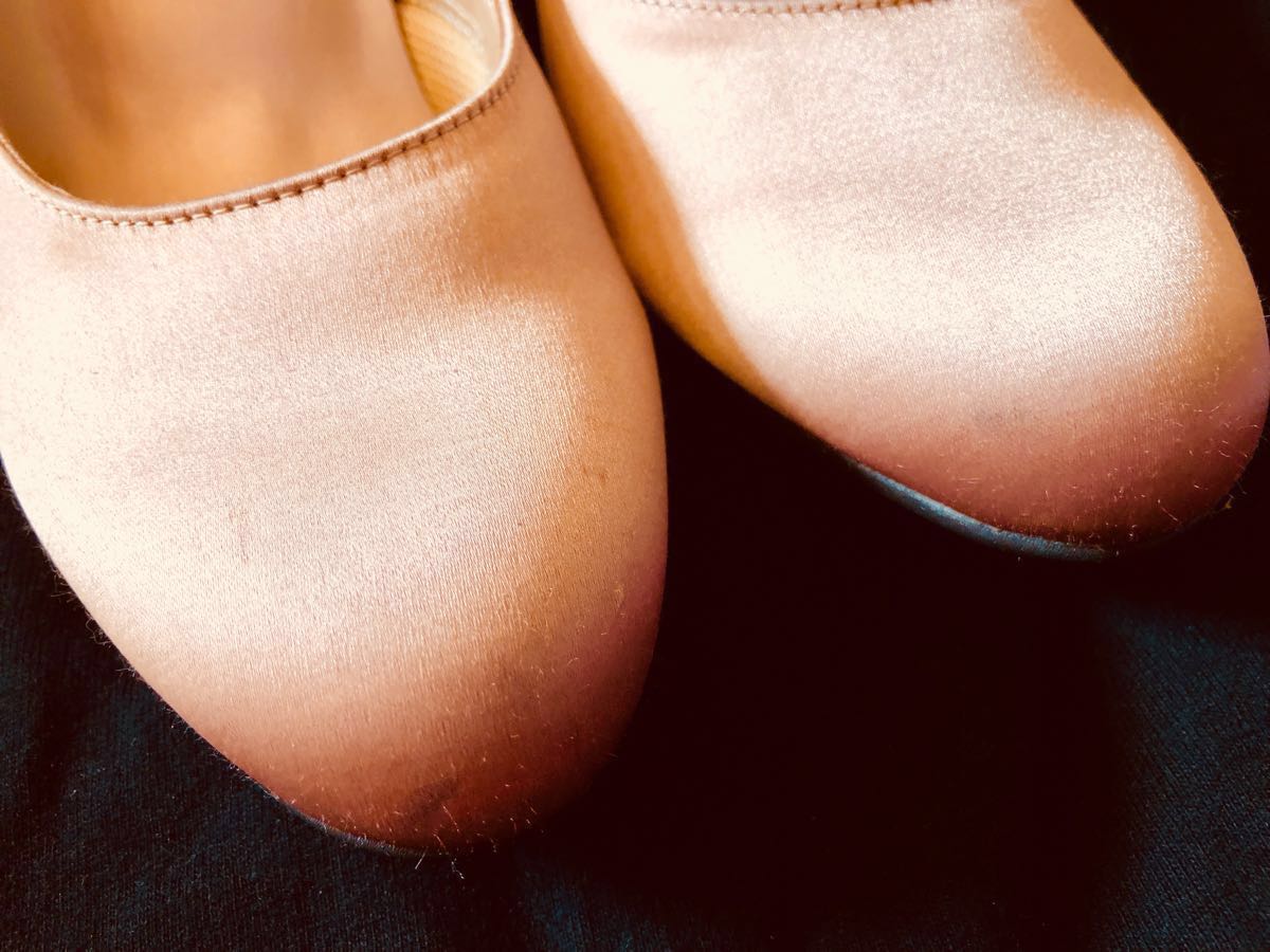 サテンのピンクゴールドのパンプスです。光線や見る角度で色が変わって見えます。