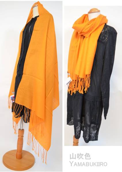 | ストール(ショール)やマフラーとして男女を問わず幅広くご使用いただけます。パシュミナの心地よい暖かさをお楽しみください。人気の70センチ大判サイズですので、ギフトやプレゼントなどにも大変喜ばれる商品となっております。結婚式などのパーティードレスの上から羽織ったり、ジャケットやコートの上からマフラーとして使用したりと幅広くお使い頂けます。温かくとても上品ですので和装、着物の上から羽織っていただくなどたくさんの外出で活用いただけると思います。薄手ですが暖かいのでバックの中に入れていただいて寒い時に羽織って頂いたり、夏場には紫外線カットや車内やオフィスでの冷房対策にも最適です。弊社としては、春秋ににお勧めのストールです。サイズ約180×70センチ 毛100% | |