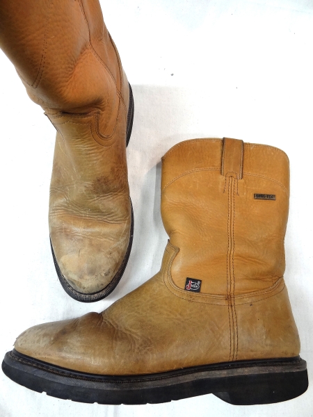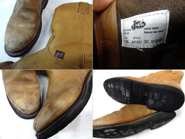 ビンテージ JUSTIN ジャスティン レザー ワーク ペコス ブーツ サイズ 11 茶 ブラウン キャメル アジ ゴアテックス ダメージ ガーデニング