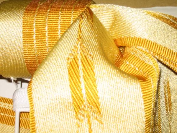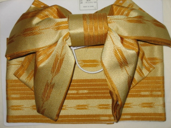 女性浴衣用、地紋柄結び帯  金茶   ポリエステル  新品(織り地紋柄ありです。波状の写りはレンズの光学的ないたずらで現品にはありません、また薄く濃く写っている場合もあります)、胴部--帯巾約16,5cmx長さ約130cm、リボン部は横に約30cm。見た範囲で汚れないと思いますので、着用には問題ないと思います、。なお処分特価で出品です。