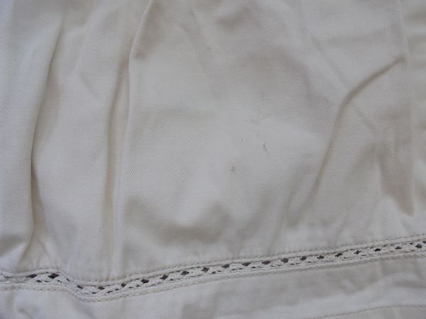 薄いシミや裾に薄い青ペンの跡、後ろの裾に薄い汚れがあります
