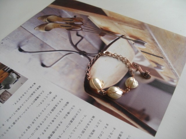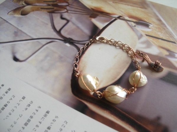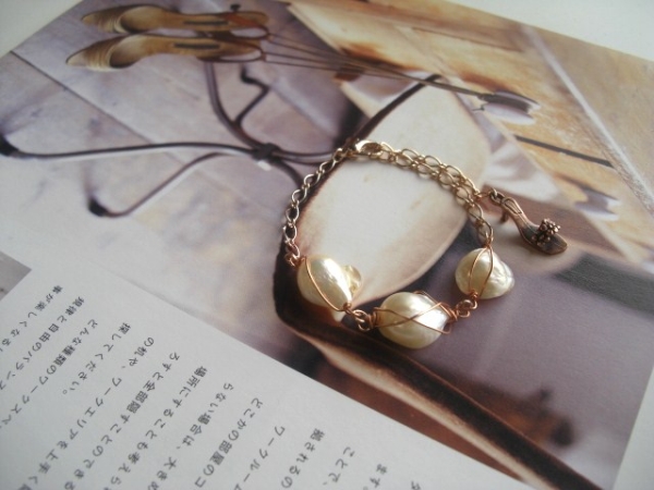 ノスタルジックな秋色・・シリーズです♪パールを+して・・個性的なバロックの淡水パールのブレスレットです♪母貝つ きの13ミリから18ミリ位の大きなバロックパールをピンクゴールドのワイヤーでデザインしました♪長さは全長23センチ位で調節自由です♪お揃いのネックレスも出品しています♪ハンドメイドを ご理解頂いてノークレーム、ノーリターンでお願いします