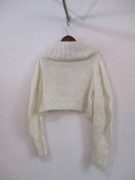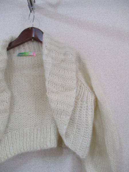 | 商品紹介 | ショール風の形がオシャレなショート丈のカーディガンです。 前は開けて着るデザインです。 色は白、やや透け感のあるローゲージで、モヘヤが混ざっているのでふんわり軽く 毛足の長い素材です。 《素材》 アクリル80% モヘヤ20% |