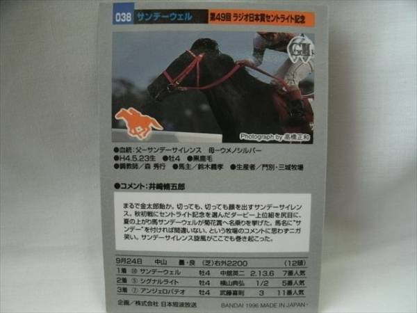 | ☆☆☆商品説明☆☆☆ 【メーカー】 バンダイ 【シリーズ】 95年サラブレッドカード 【番号】 038 サンデーウェル 【種類】 GⅡカード 【数量】 1枚 サラブレッドカードの第1弾95年度のカードになります。 |