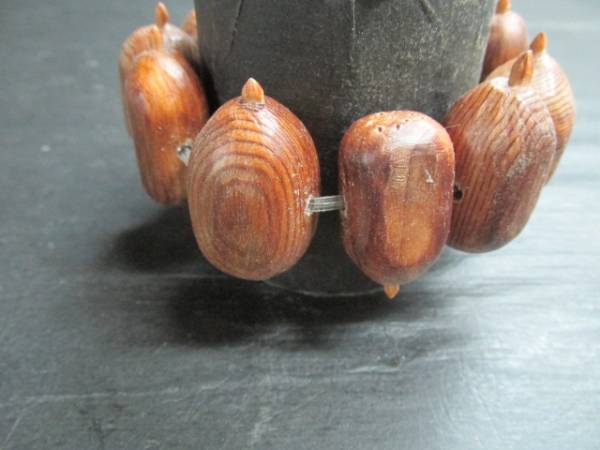 屋久杉の土埋木が手に入ったので彫刻で一つ一つドングリを丁寧に大きさを少しずつ変えて11粒彫りだして、それをシリコンゴムで連ねてブレスレットに仕立てました。屋久杉の細かい木目がきれいに引き立つように仕上げは蝋を浸み込ませて仕上げる蝋仕上げで仕上げました。