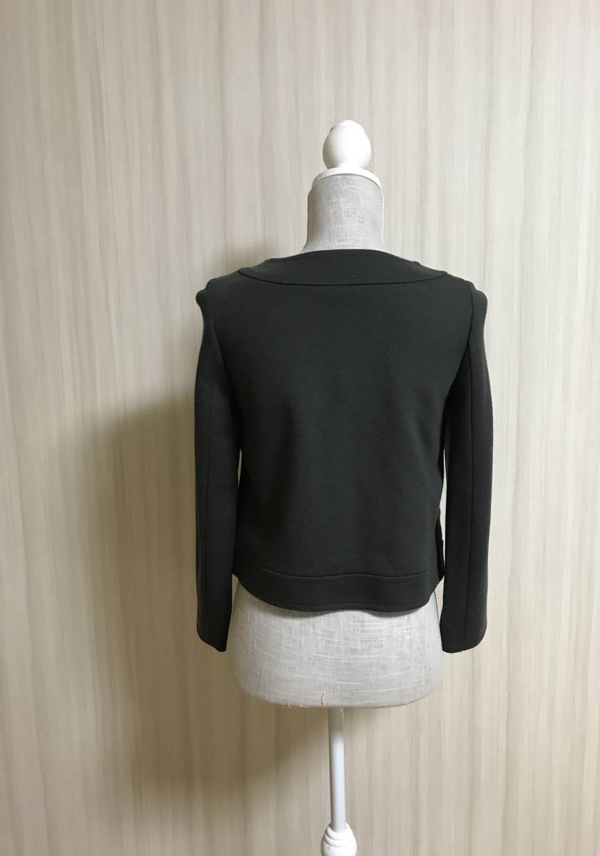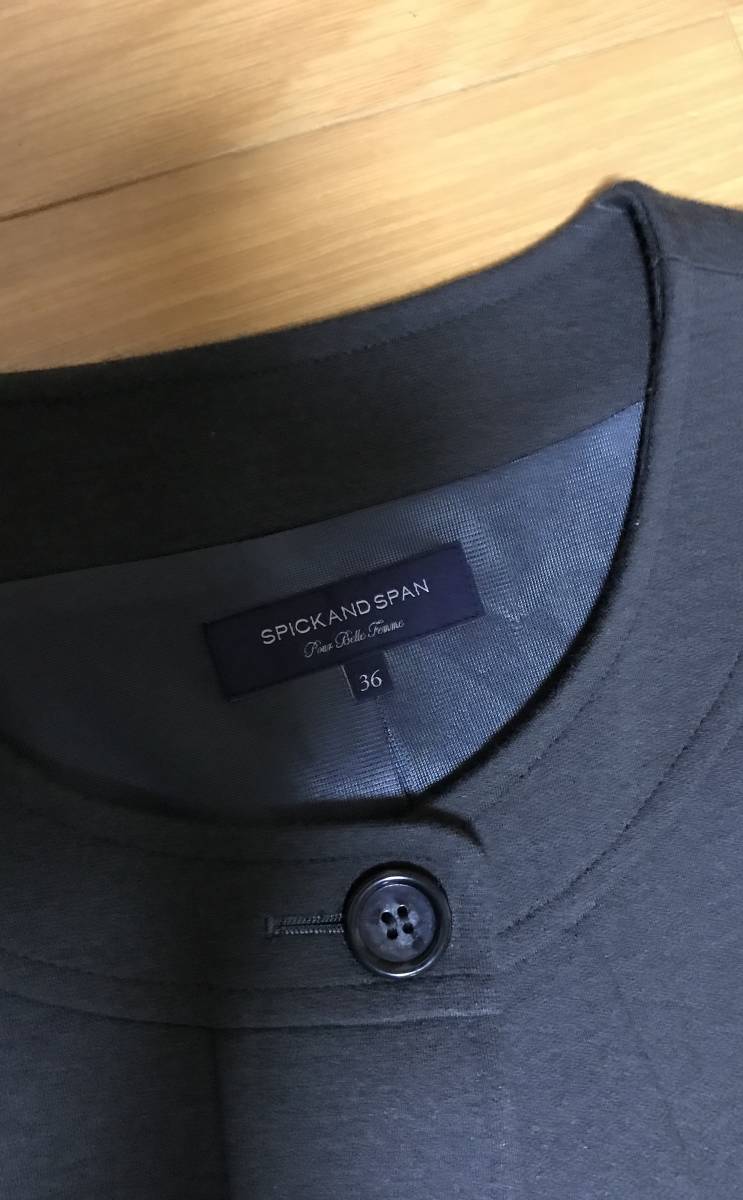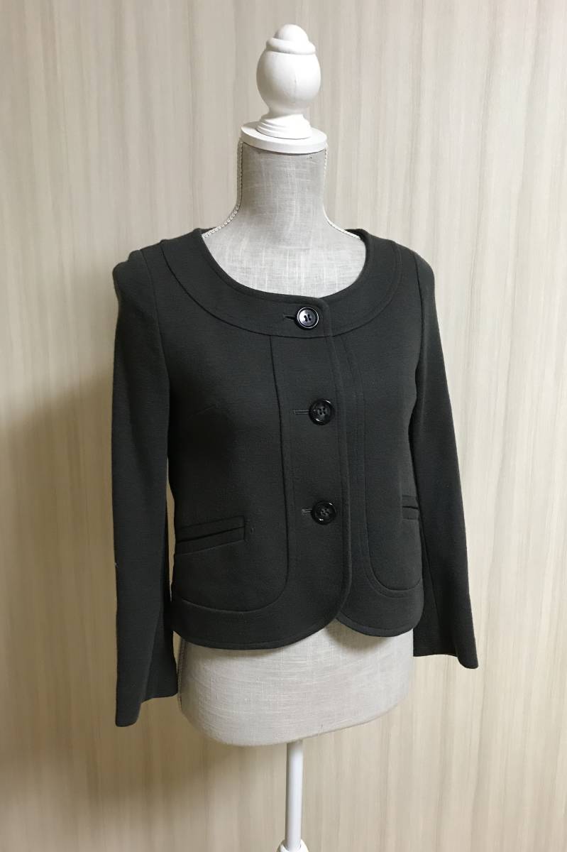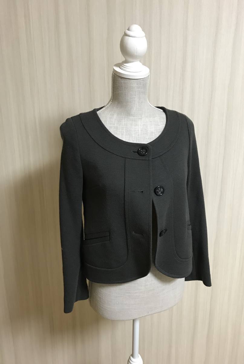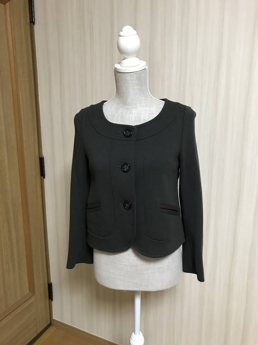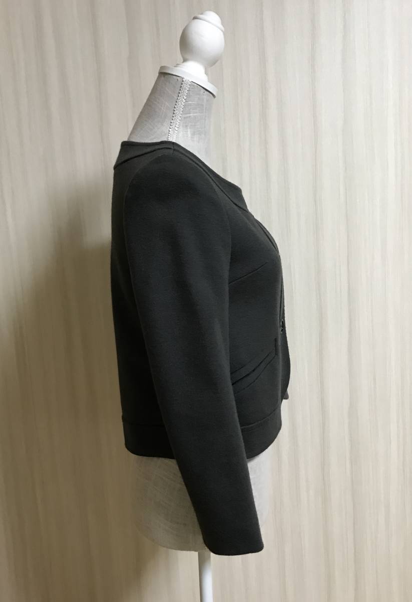ノーカラーでエレガントなダークグレーのジャケットです。
