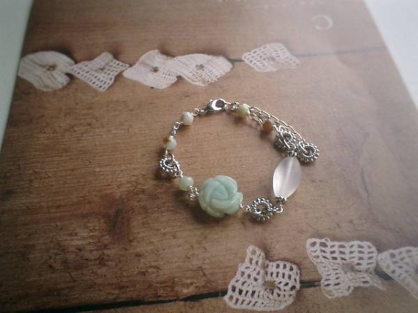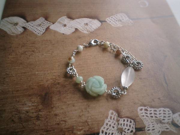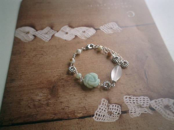 ロマンチック・パターンシリーズです♪眠り姫の薔薇・・神秘的なアマゾナイトのブレスレットです♪繊細なアマゾナイト、フロスト水晶にアマゾナイトの薔薇を合わせてロマンチックな表情です♪アマゾナイトは8×6ミリ、フロスト水晶は20×10ミリのナツメです♪トップの薔薇は18ミリ位です♪長さは全長23センチ位で調節自由です♪お揃いのネックレスや同じシリーズも出品しています♪♪シンプルでいつまでも着けられるデザインを考えて作りました!ハンドメイドをご理解頂いてノークレーム、ノーリターンでお願いします