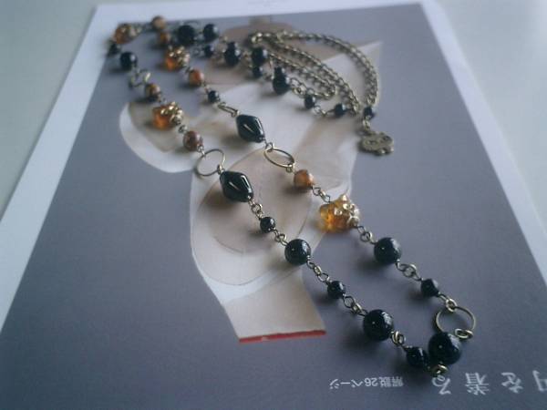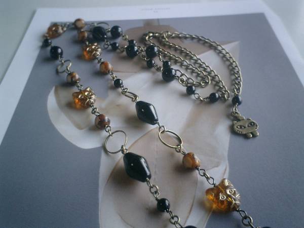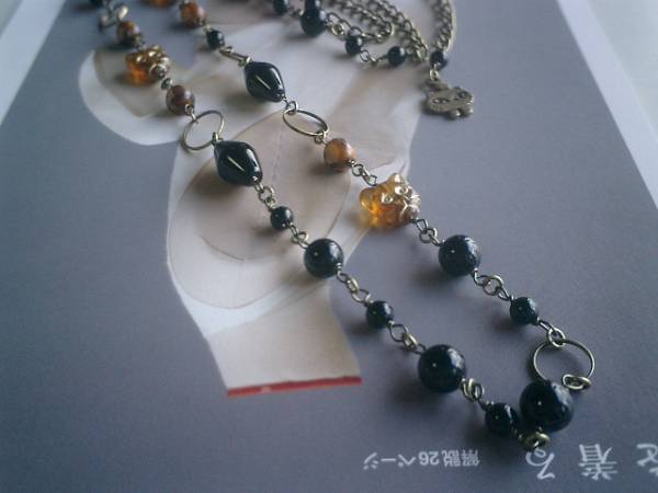 ロマンチック・パターンシリーズです♪都会の猫さん・・シックなオニキスのネックレスです♪6ミリから15ミリ位までの丸玉やスクエアカットのオニキスに12ミリの琥珀色のチェコの猫さんやデザインビーズを合わせて大人のロマンチックしています♪長さは全長102センチ位で調節自由です♪♪2連にされても素敵です♪お揃いのブレスレットや同じシリーズも出品しています♪♪シンプルでいつまでも着けられるデザインを考えて作りました!ハンドメイドをご理解頂いてノークレーム、ノーリターンでお願いします