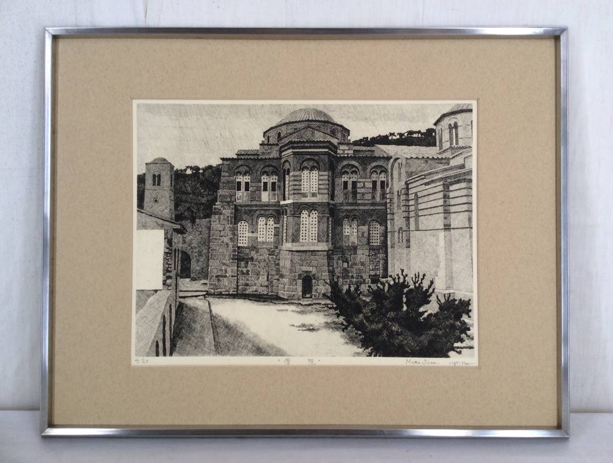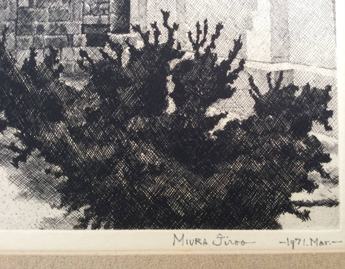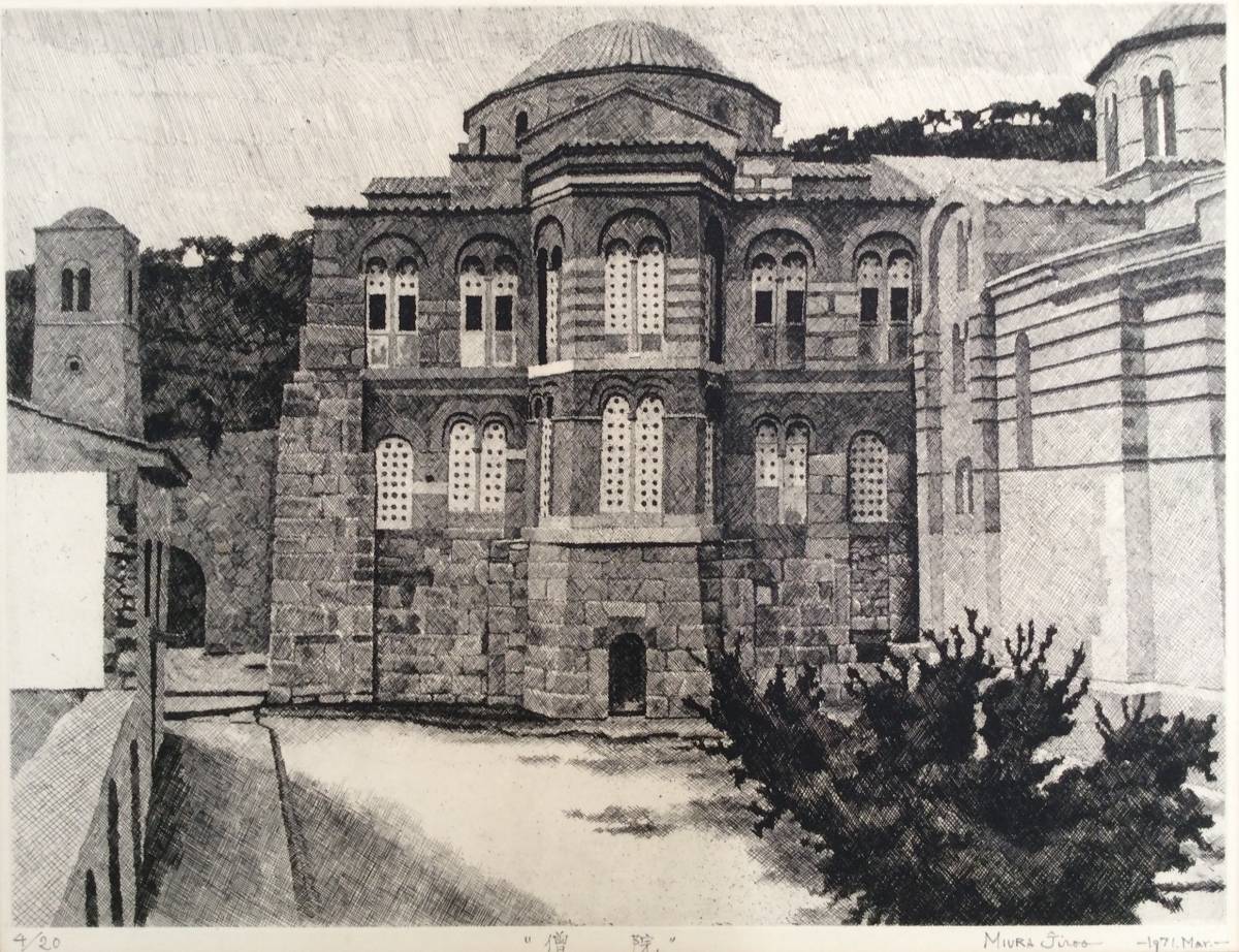 【真作】《エッチング》MIURA Jiroo「僧院」鉛筆サイン 額装