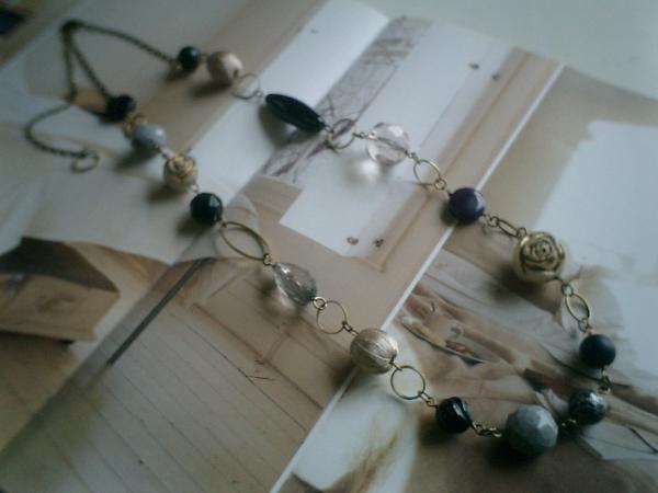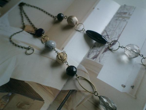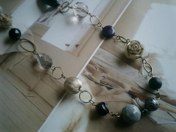 美術館をイメージして♪アンニュイ(?)な雰囲気のネックレスを作りました♪シックな黒とグレーでまとめてパリ(??)っぽいアンティークな雰囲気で作りました。オニキスはナツメ型、10ミリのSライン、12ミリの丸カット、10ミリのつやなし丸玉、パープルアゲートは12ミリのコイン、12ミリのサテンボール、両面薔薇の樹脂ビーズ、アンティークの樹脂ビーズは雰囲気のあるカット玉やナツメカットとお色も形も様々です♪繊細なチェーンでまとめてさりげなくロマンチックしています♪長さは全長77センチ位で調節自由です♪♪2連にしたり、ブレスレットにしても可愛いです♪飽きのこないいつまでも着けられるデザインを考えて作りました!お揃いのブレスレットも出品しています♪ハンドメイドをご理解頂いてノークレーム、ノーリターンでお願いします