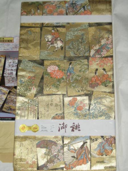新品未使用六通柄袋帯。袋帯は絹80%その他20% 綿芯入れ仕立て上げでの出品です。巾30,9cm長さ約443,5cm西陣仕立て2349百人一首御幸文