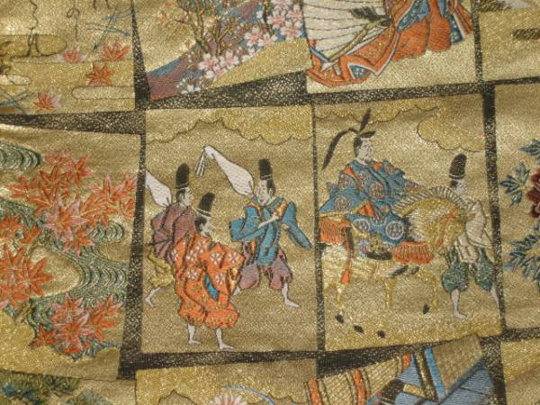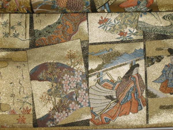 通常は翌日発送です。訪問着用袋帯(綿芯での本仕立て済み)帯地=絹100%金属糸等使用〈新表示絹80%その他20%) 西陣6通柄袋帯 表地は金地(カルタとかるたの間は墨地に金。裏地はくすみ薄金色。巾、長さともM寸規格内(当然二重太鼓や変わり結びもしていただけます、上等な訪問着や、振袖、留袖むき)。 訳はないはずですが、 訳がもしあってもの処分価格で出品です