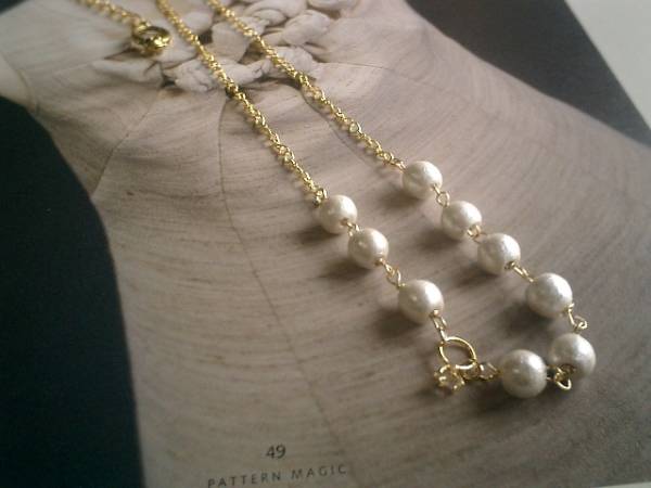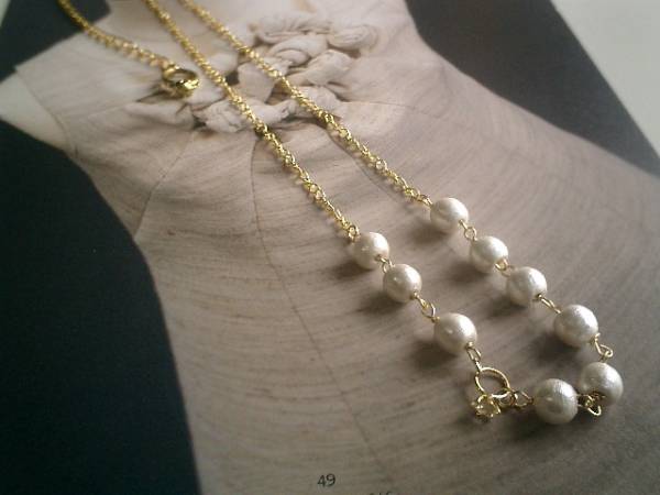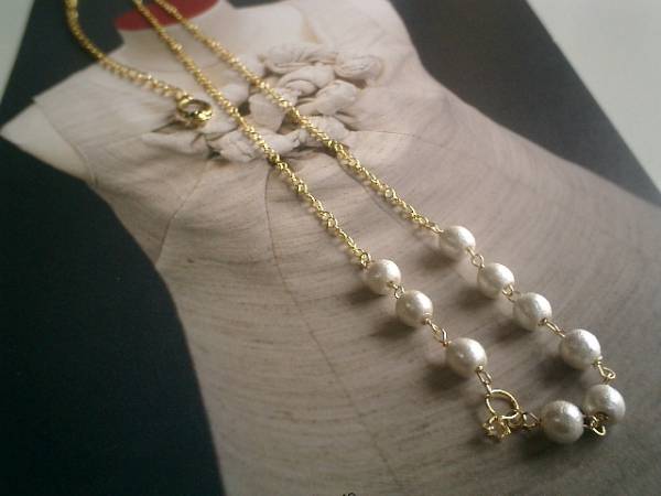 ロマンチック・セレクト・・シリーズです♪オフホワイトのコットン・パールのネックレスです♪ジルコニアのドールリングを合わせて可憐な表情です♪コットン・パールは8ミリ位です♪長さは全長68センチ位で調節自由です♪チョーカー風にされても素敵です♪お揃いのブレスレットも出品しています♪シンプルで飽きのこないいつまでも着けられるデザインを考えて作りました!ハンドメイドをご理解頂いてノークレーム、ノーリターンでお願いします