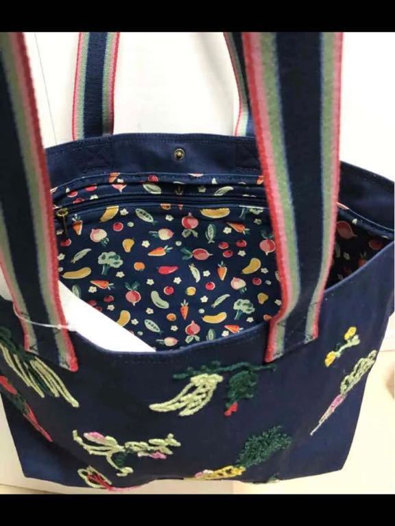 刺繍入りトートバッグは裏地にインスピレーションを得たミニベジプリントのコットンキャンバス製で、内側にジッパーポケットが付いています。