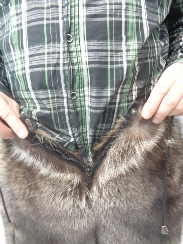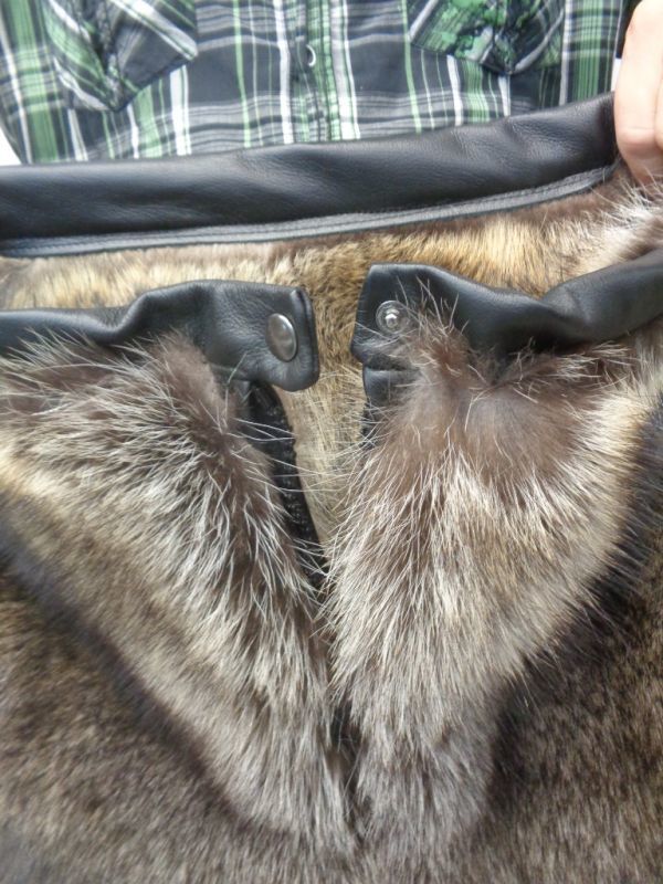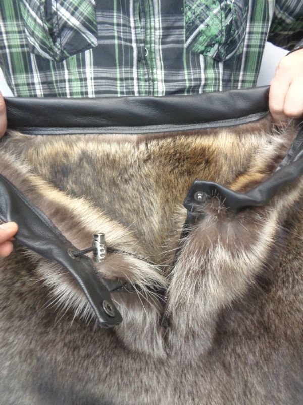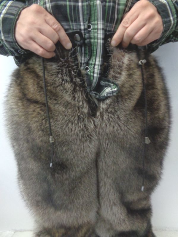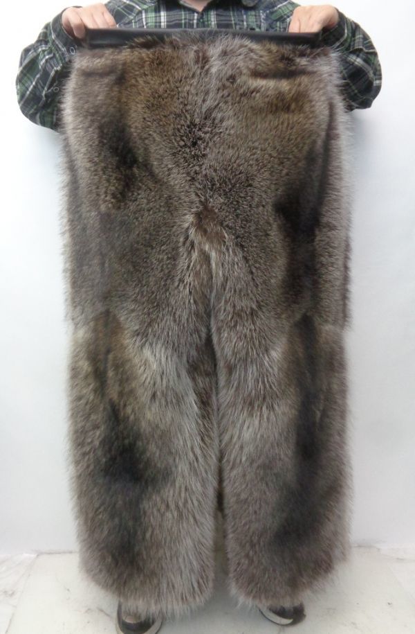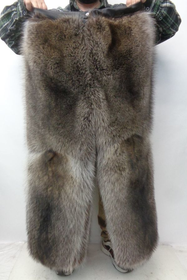 あたたかいラクーン毛皮ファー・パンツ。両面毛皮仕立て。内側も外側もファーの柔らかな手触り。ウェスト部分にブラック・レザー。ウェスト内側に引き紐付き。スナップボタンとファスナーつき。