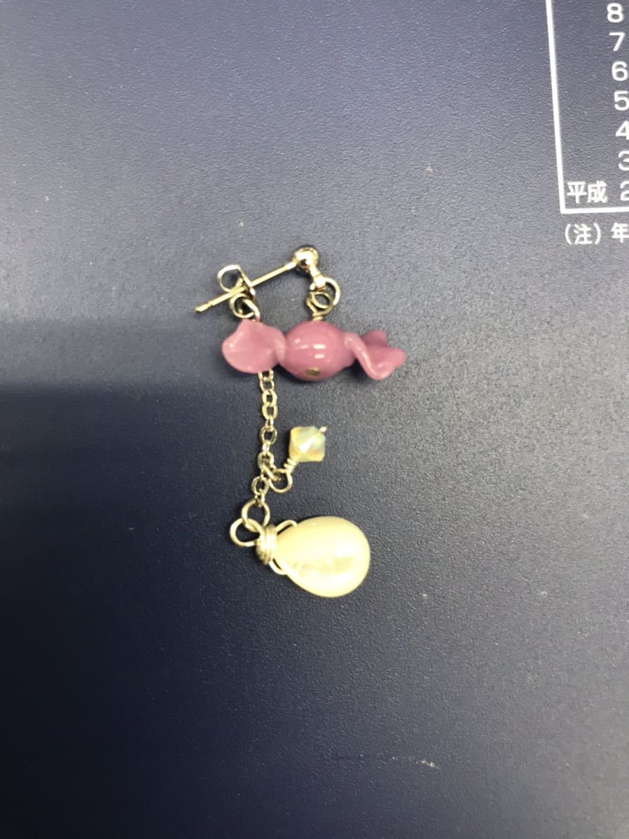 5回ほど使用しましたキャンディーピアスです。形が珍しく、キャッチにもビーズや白蝶貝がついています。キャンディーの素材は確かガラスだったと思います。キャッチの長さが約4センチ、キャンディーの横幅の長さは約1.7センチです。耳から垂れる長さは約1.5センチくらいです。