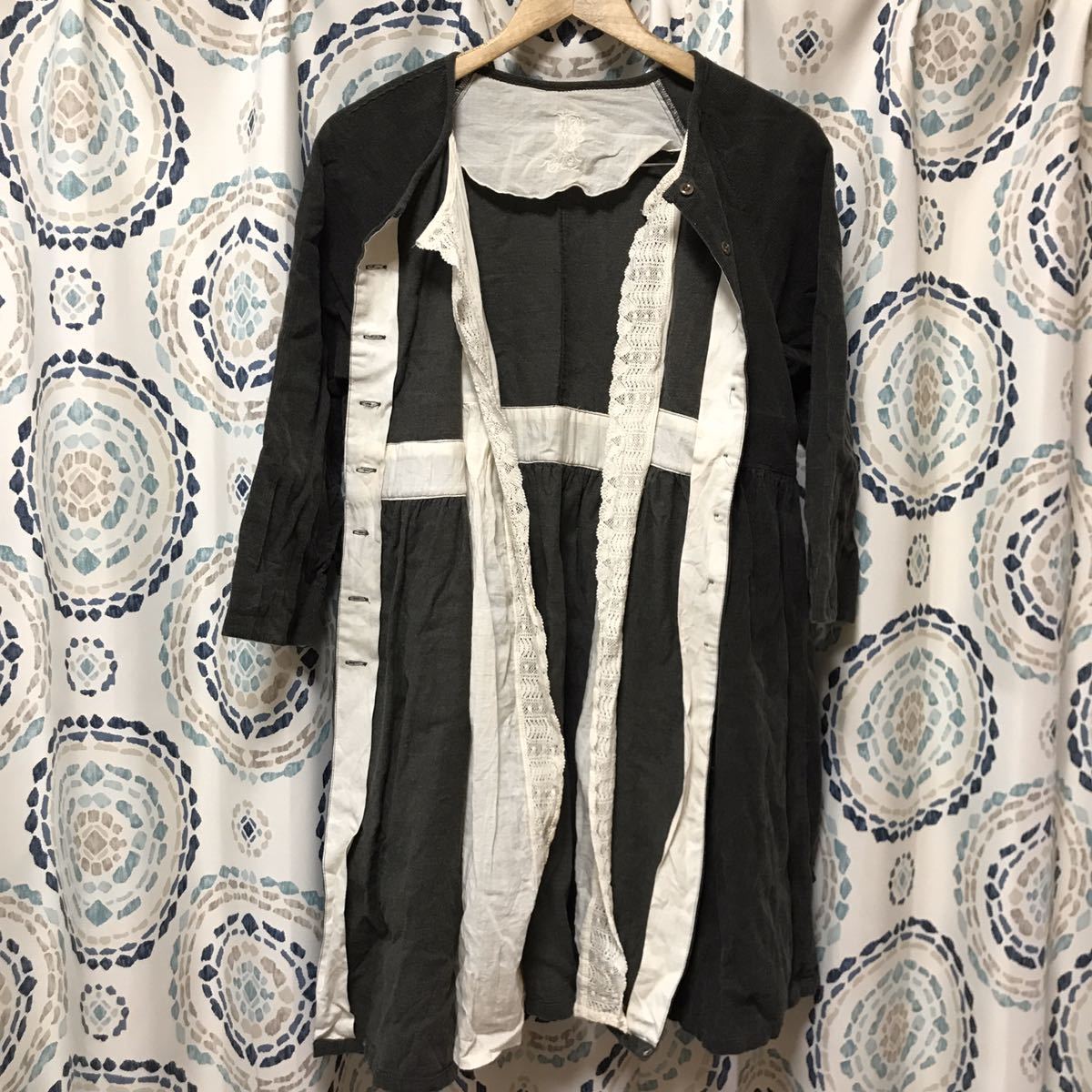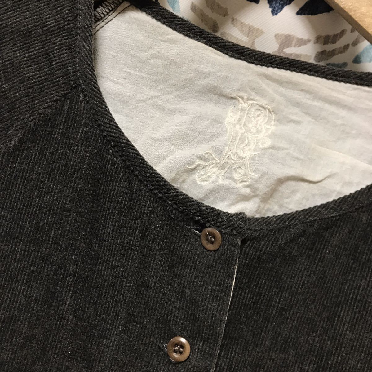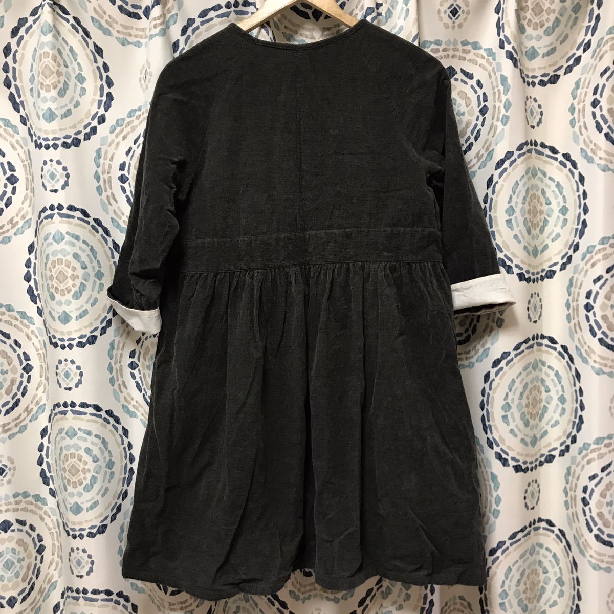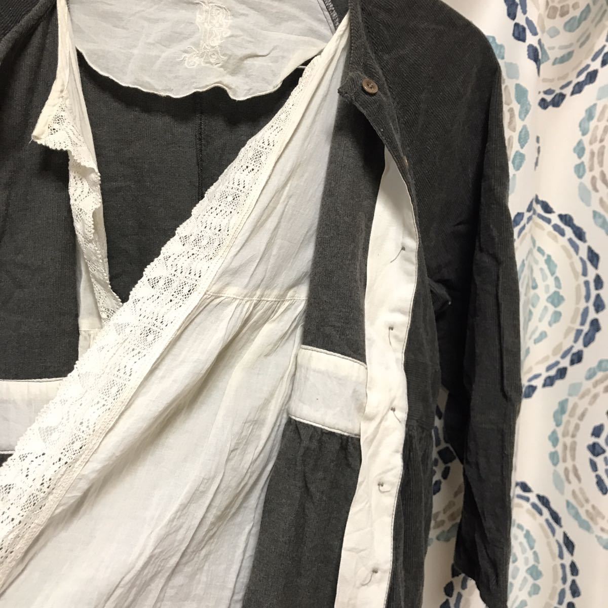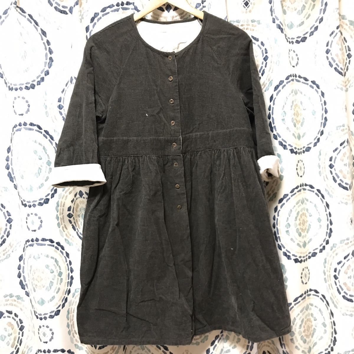 ◆柔らかい細コーデュロイ素材♪チュニックワンピースとしてもつかえますが前を開けるとナチュラルなコットンのカギ編レースがヒラっと見える素敵なデザインなので羽織りにも♪袖は七分袖くらいになります