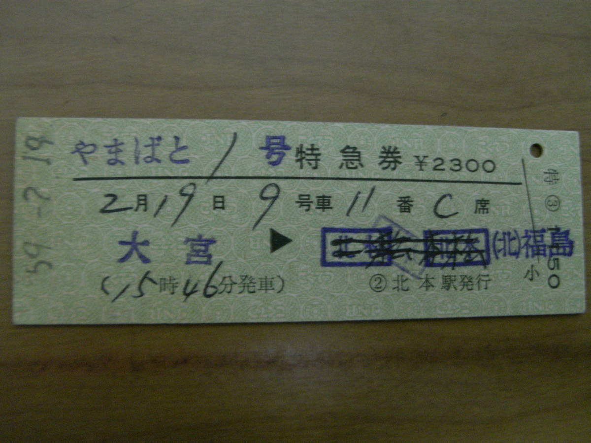 やまばと1号 特急券 大宮→(北)福島 昭和59年2月19日発行 北本駅発行