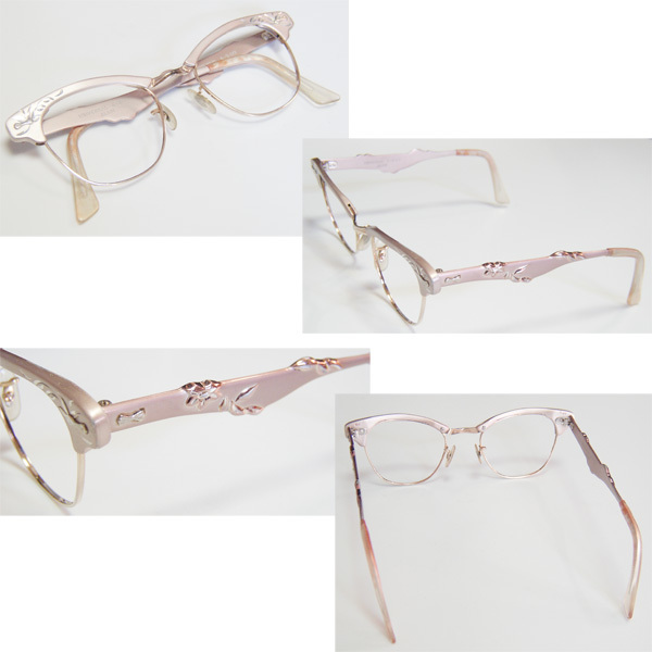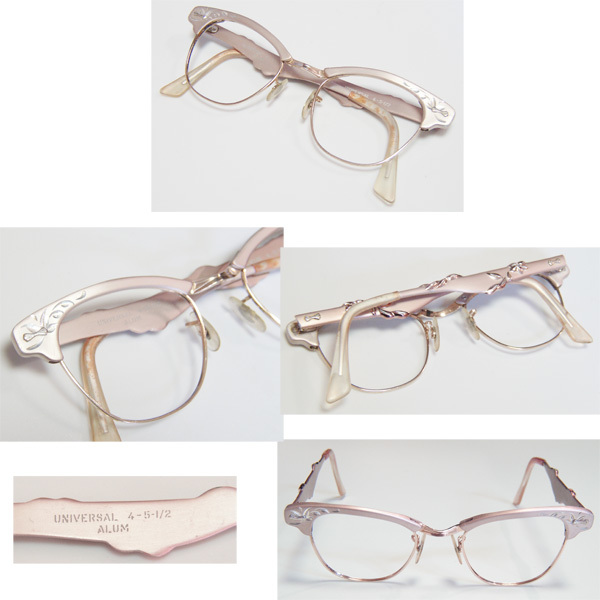 ヴィンテージ UNIVERSAL フレームです。状態は、古い物ですので、経年による擦り傷や薄汚れと、角などに薄い色のはげや、テンプル先辺りに(先セル)、薄汚れや変色がありますが(画像3)、ビンテージの雰囲気ある物です。アメリカで購入しました。デザインのとても可愛い凝った作りです。色は、薄いシャンパンピンクの色合いです。古い物ですので、状態はそれなりですが、年代物の風格とレトロ感ある物です。サイズは、US 4 - 5 1/2で、実寸は正面の縦4.2cm、横幅13.2cm、テンプル長さ12.6cm程です。ビンテージ物とご理解頂いて、ノークレーム、ノーリターンでお願いします。