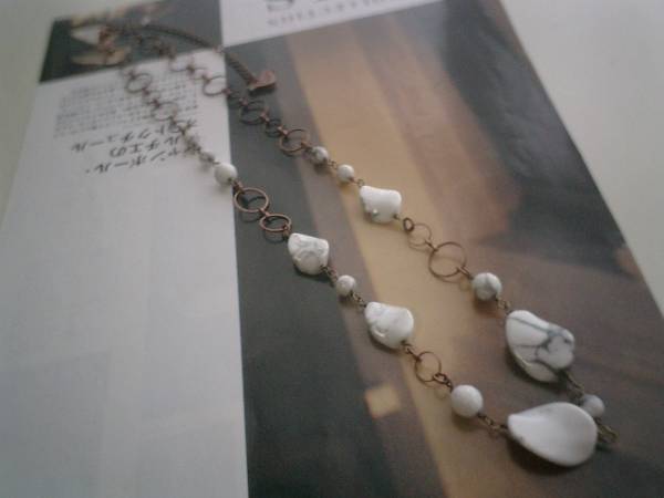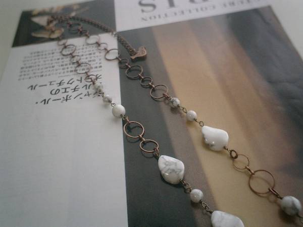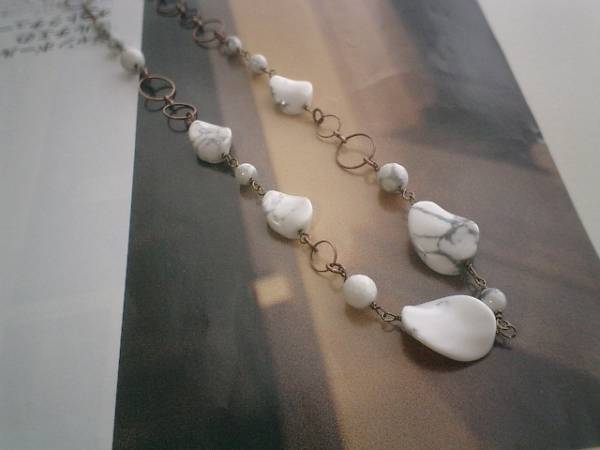後ろボタンのワンピース・・シリーズです♪白いハウライトのネックレスです♪模様入りのハウライトが可憐な表情です♪6ミリの丸玉、8ミリのランダムカット、16×13ミリ、15×20ミリのツイストオーバルのホワイトハウライトにデザインチェーンを合わせてシンプルモダンなデザインです♪長さは全長70センチ位で調節自由です♪お揃いのネックレスやブレスレットやイヤリングも出品しています♪シンプルで飽きのこないいつまでも着けられるデザインを考えて作りました!ハンドメイドをご理解頂いてノークレーム、ノーリターンでお願いします