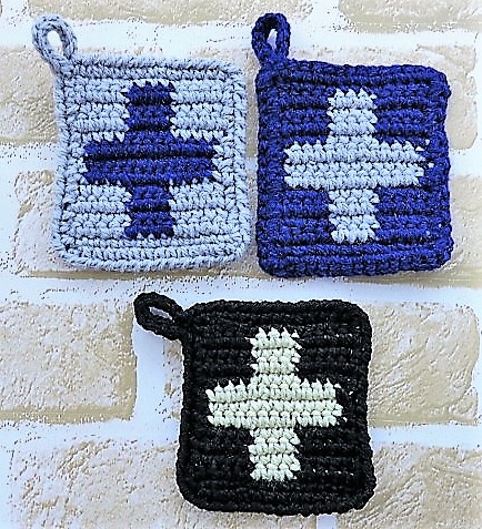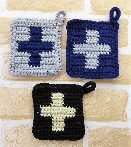 北欧テイストのクロスのエコたわしです。毛糸1本で2本の糸を編みくるみしています。伸びやすい吊り紐も太めに編んでいます。