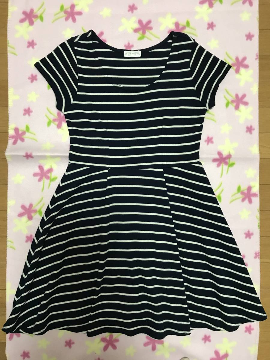 イーハイフンで購入したワンピース、ネイビーとホワイトのボーダーになります。素材はポリエステル65%、レーヨン35%で、シワになりにくい素材です。スカート部分のみ裏地があります。首元からスカート裾まで測りましたところ、約77㎝でした。スカート部分にボリュームがあるため歩くと動きが出てかわいいです。3回程着用したUSDであること、自宅保管であることをご了承下さい。