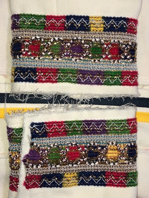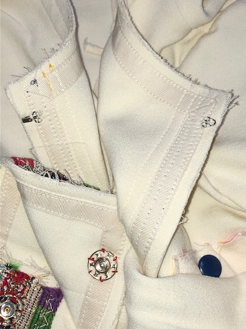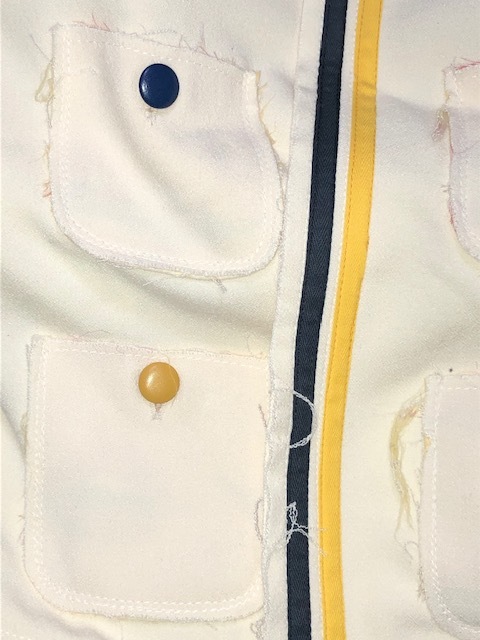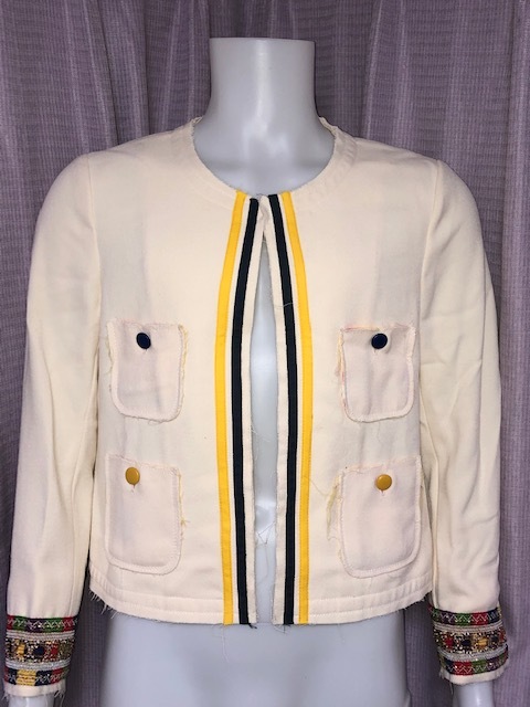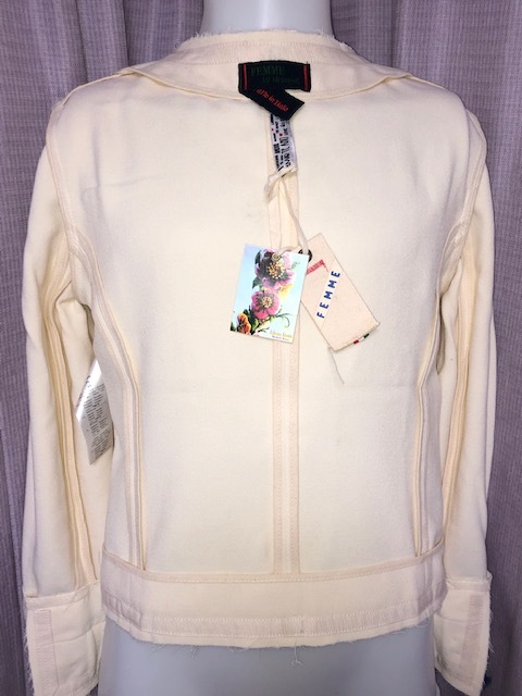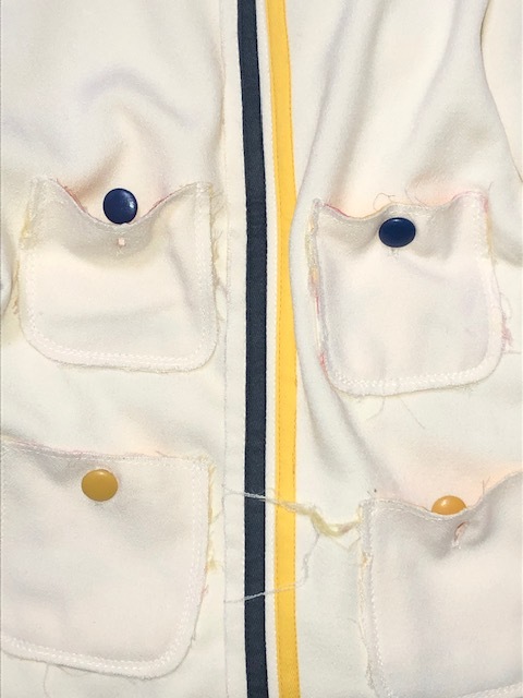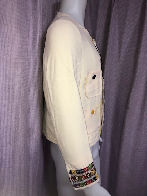 尚、各部(前身頃、後身頃、ノーカラー部、袖口等)の周り、切替し、縁取り部分等にデザイン意図でのホツレがあります(オークション写真参照)。