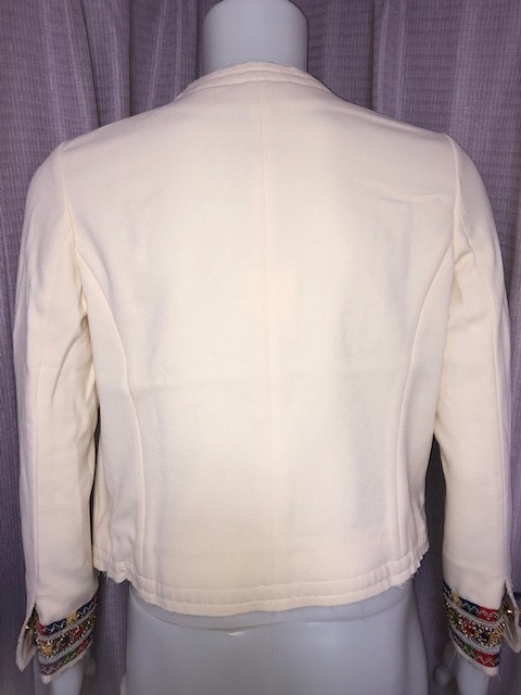 今回その独創的、唯一無二、独特な世界観“FEMME by Michele Rossi”の独創的、唯一無二、佳麗で素敵なフォークロア調ノーカラージャケット(サイズ表記IT44=日本11(L)、各部実寸サイズは、着丈:約50cm-肩幅:約40cm-身幅:約46cm-袖丈:約57cm-袖幅:約13cm※当方アパレルのプロではありませんので多少の誤差はご了承ください-イタリア製/Made in Italy:参考小売価格711ユーロ≒86、014円(2019年9月 イタリア ボローニャ)》を出品致します。この機会に是非!!