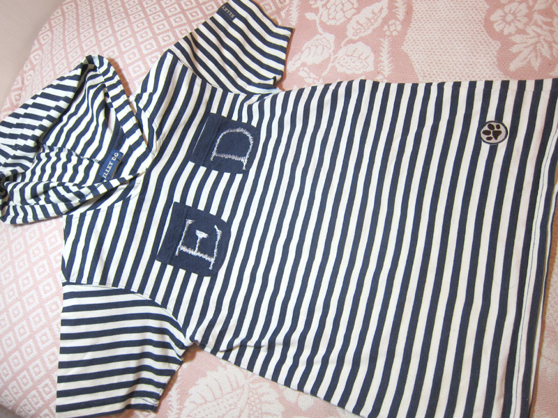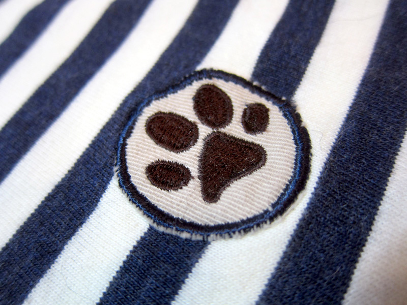 可愛いワンちゃんの足跡、パウがあしらわれた可愛いネイビーボーダーのフード付きTシャツです。