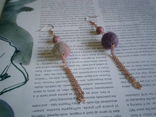 秋のクローゼットシリーズです♪キュートなフェルト玉とロードナイトのピアスです♪モーヴピンクやベージュピンクやパーピルなど様々なお色が混ざったフェルト玉は15ミリ位です♪8ミリのアフリカンロードナイトの丸玉とピンクゴールドのチェーンを合わせてアンニュイな大人の表情です♪長さは11センチ位です♪イヤリングへの変更もOKです♪お揃いのネックレスやブレスレットや同じシリーズも出品しています♪シンプルで飽きのこないいつまでも着けられるデザインを考えて作りました!ハンドメイドをご理解頂いてノークレーム、ノーリターンでお願いします