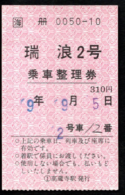 瑞浪2号乗車整理券(高蔵寺駅発行)