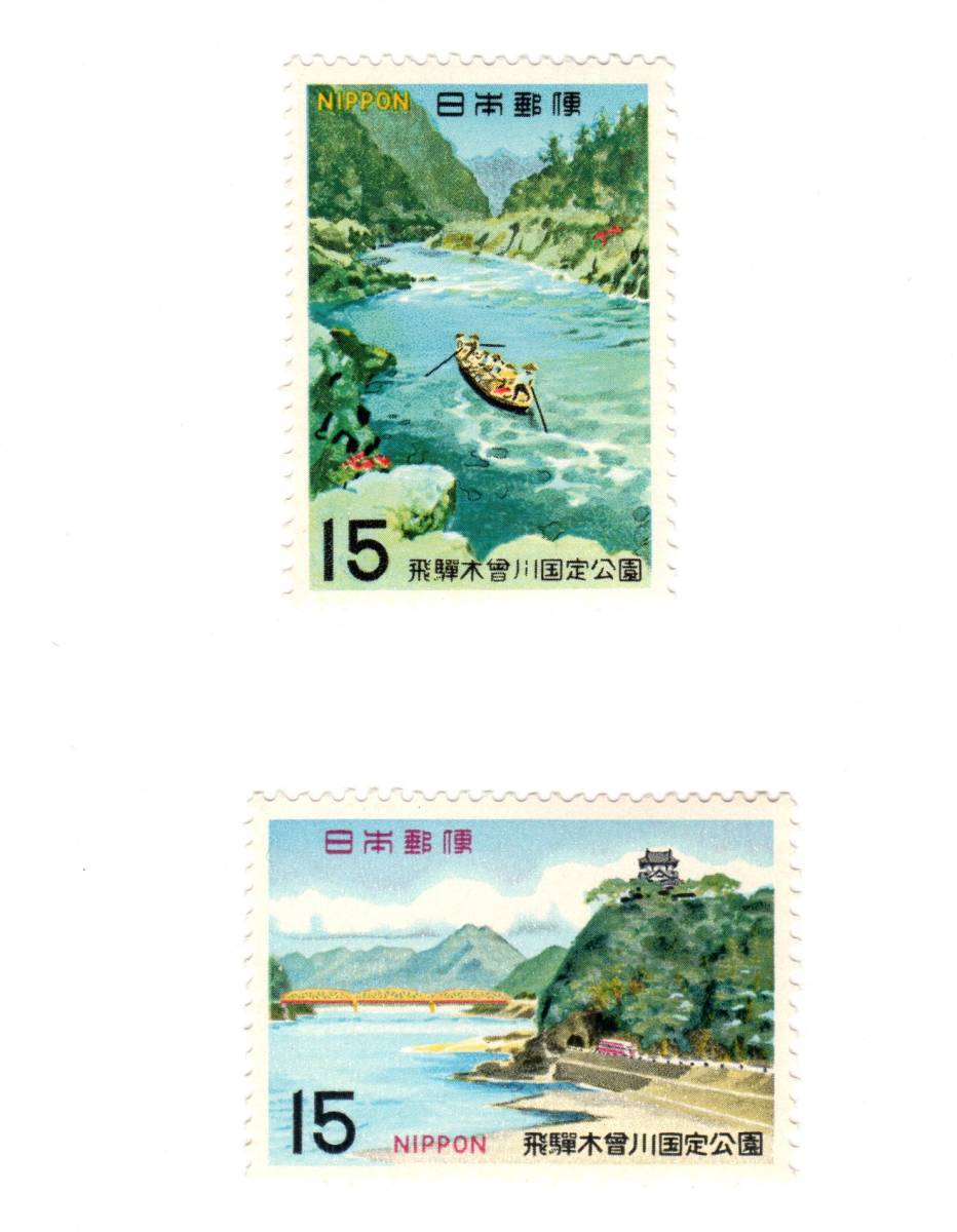 昭和43年1968「国定公園切手 飛騨木曽川/木曽川~犬山城と木曽川」15円切手2枚・未使用【送料無料】「熊五郎の切手」00800242
