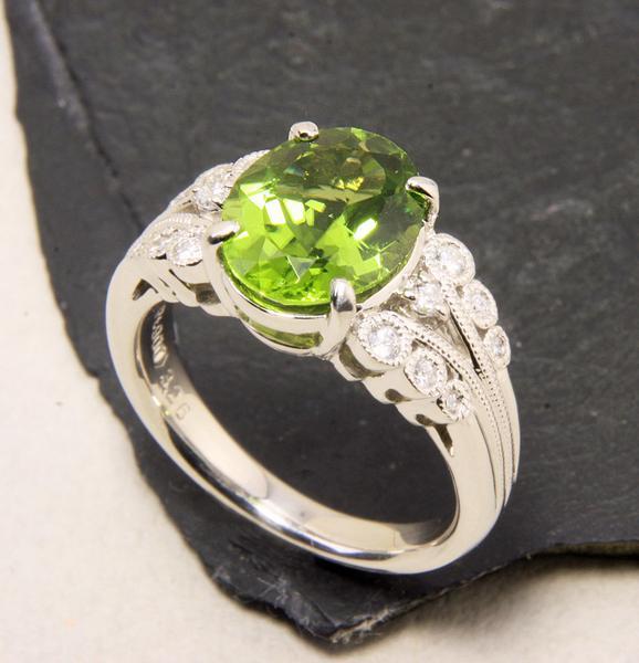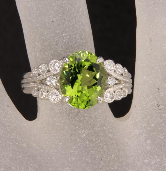 Pt900★天然ペリドット3.26ct+ダイアモンドリングです。