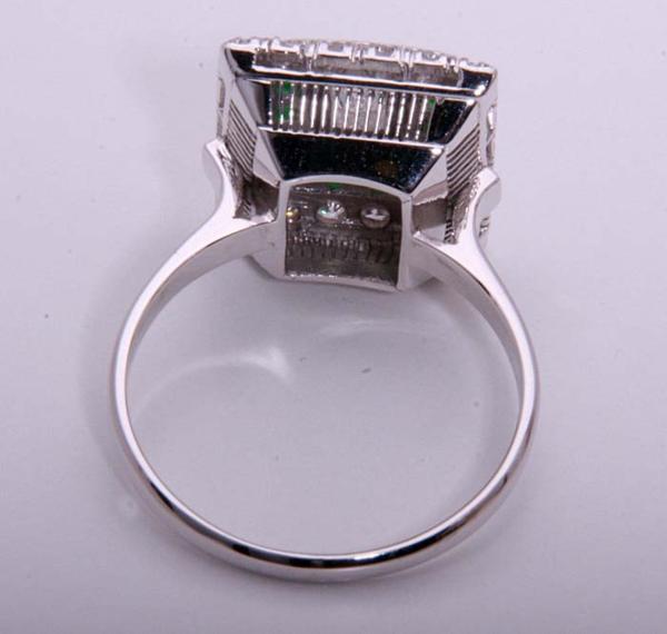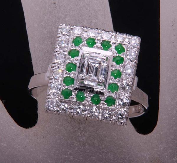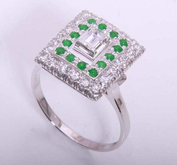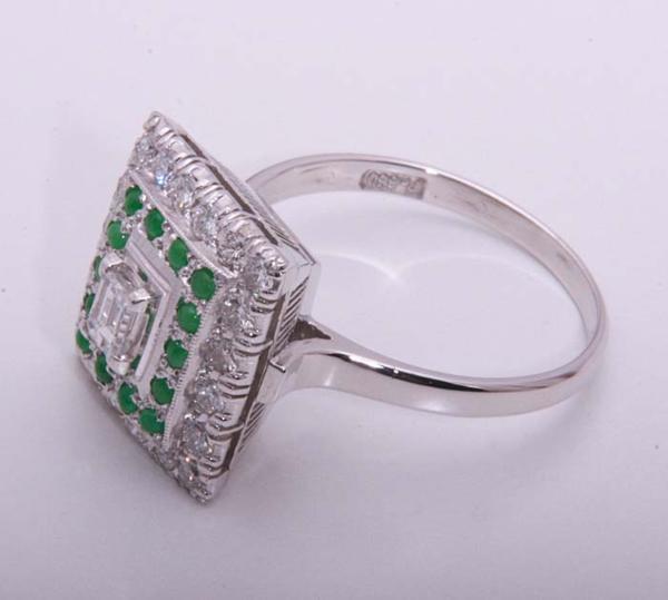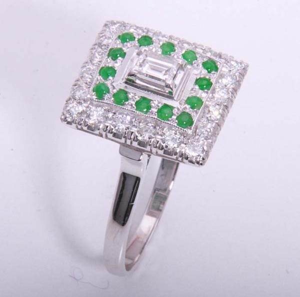 中央のダイアを囲むように小さなエメラルドとメレダイアが留められたリングです。