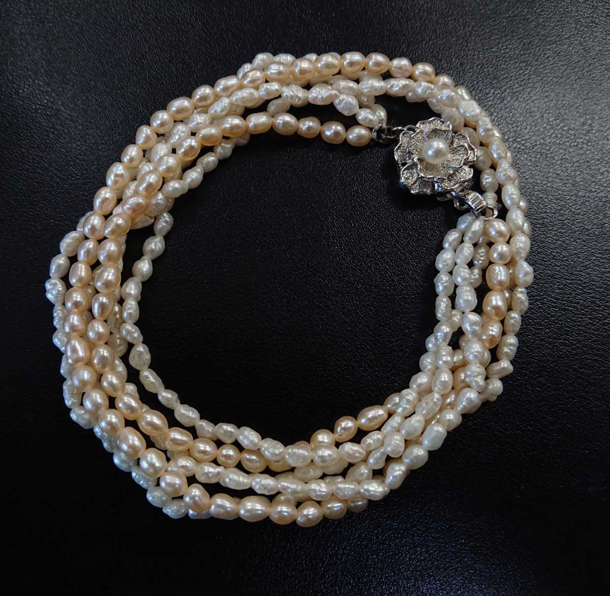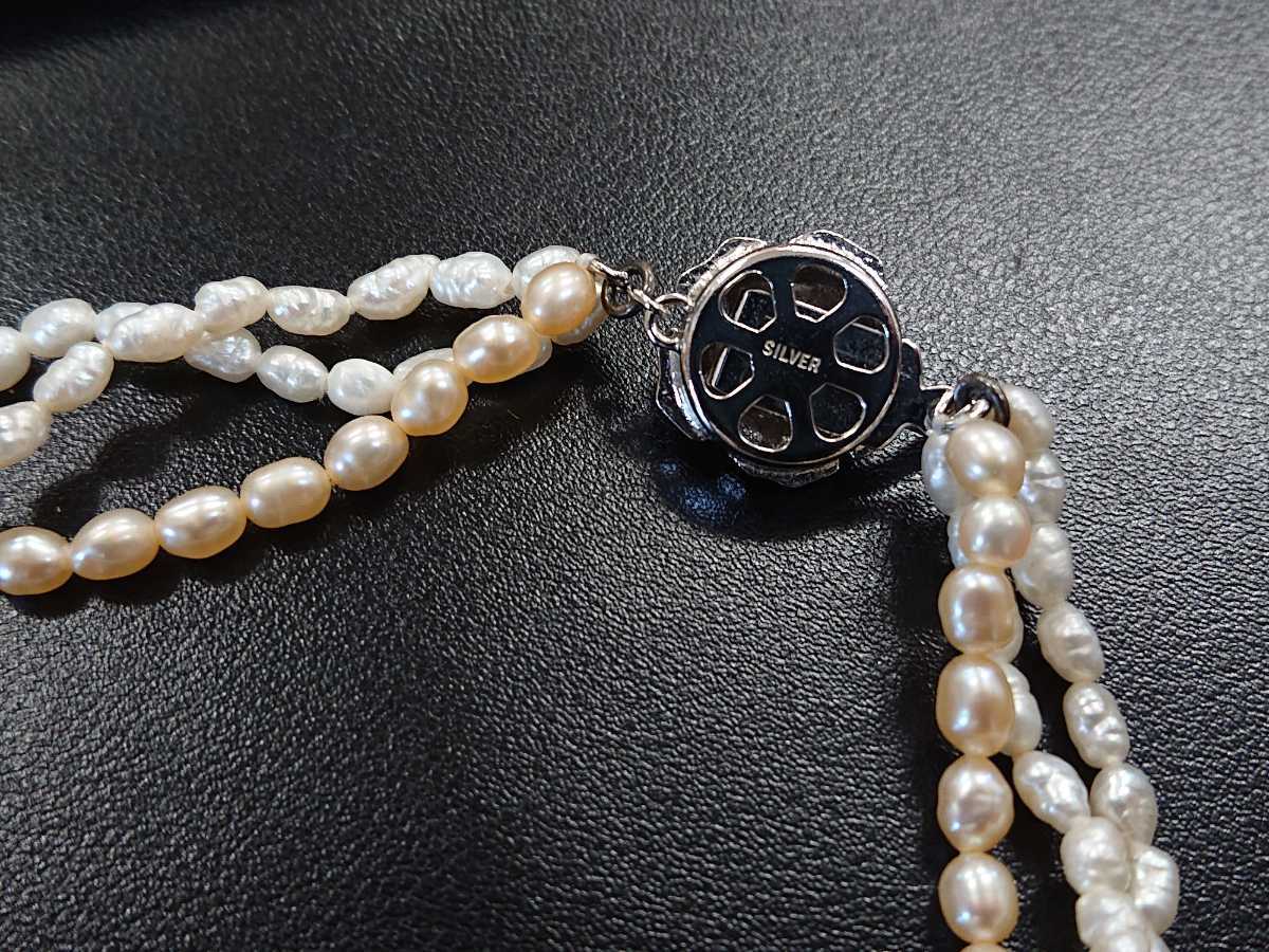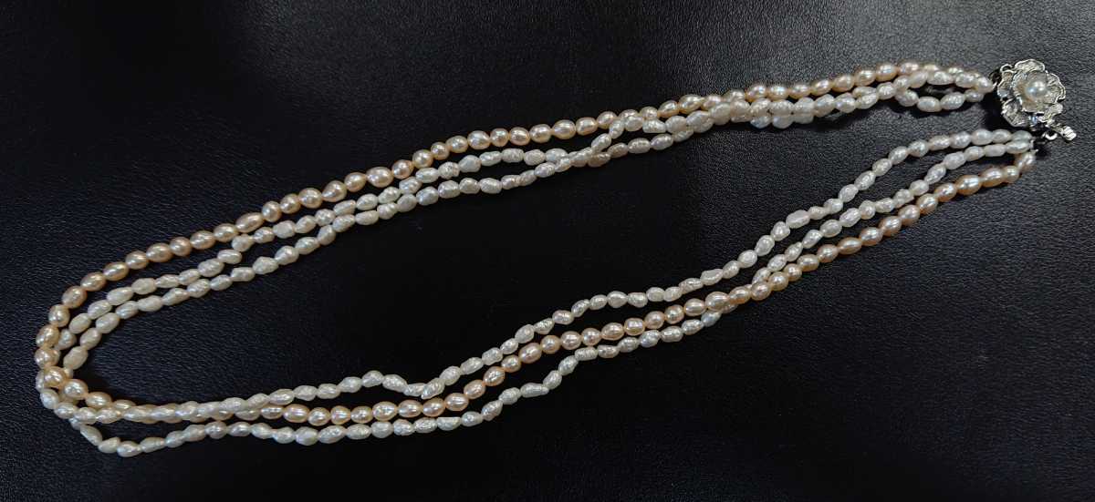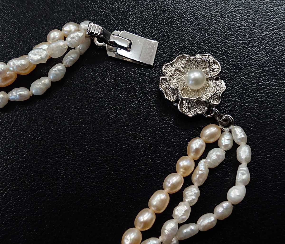 淡水パール3連はネックレスとしてはボリュームがでて、胸元華やかに見えます。留め具はワンタッチで簡単に開閉できます。結婚式の二次会などにもおすすめです。 淡水パールはそれぞれ色や形状がことなりますので、状態については、画像ご確認ください。 お安く出品しておりますので、ノークレームノーリターンでお願いします。