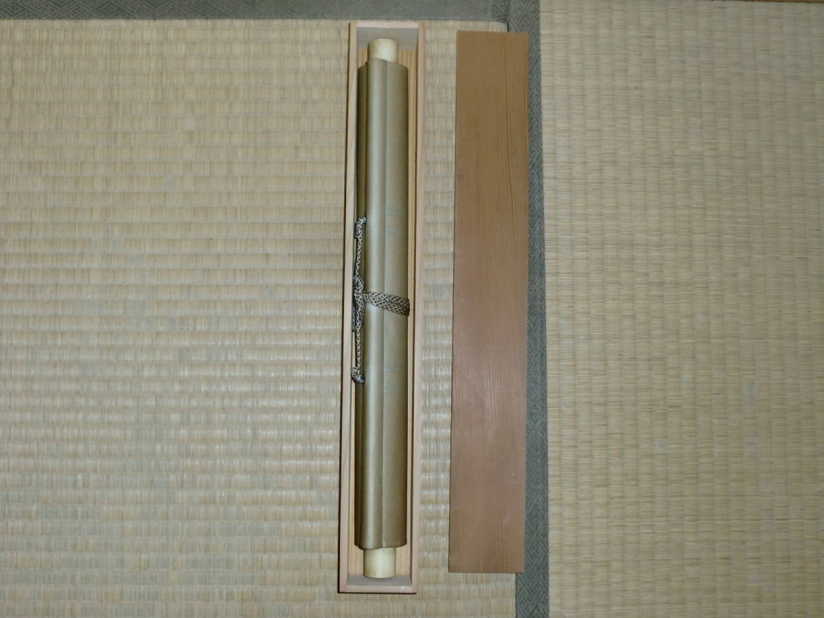 紙本、表装 絹、軸先 樹脂(汚れアリ)、木箱(蓋式)。