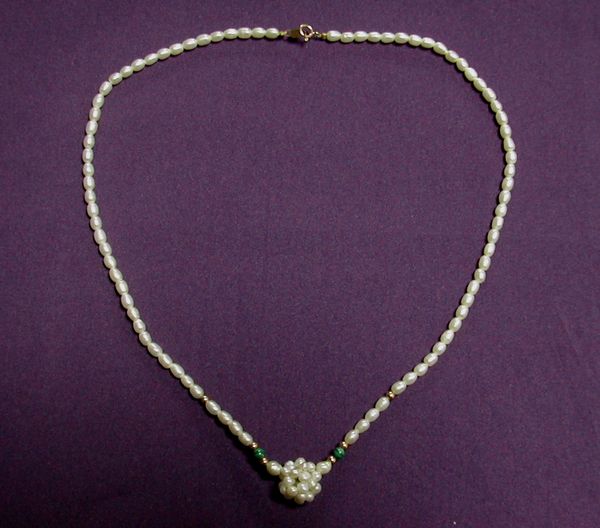 トップにはボール状に繋いだパールと緑系、金色の珠が付いています。