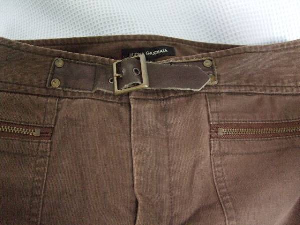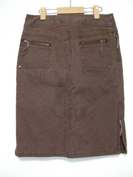 | 商品紹介 | ベーシックなブラウンのスカートでが、チャックがポケット、スリットにありオシャレです。 ベルト、チャックヒモは、牛革が使われています。 素材 綿95% ポリウレタン5% |