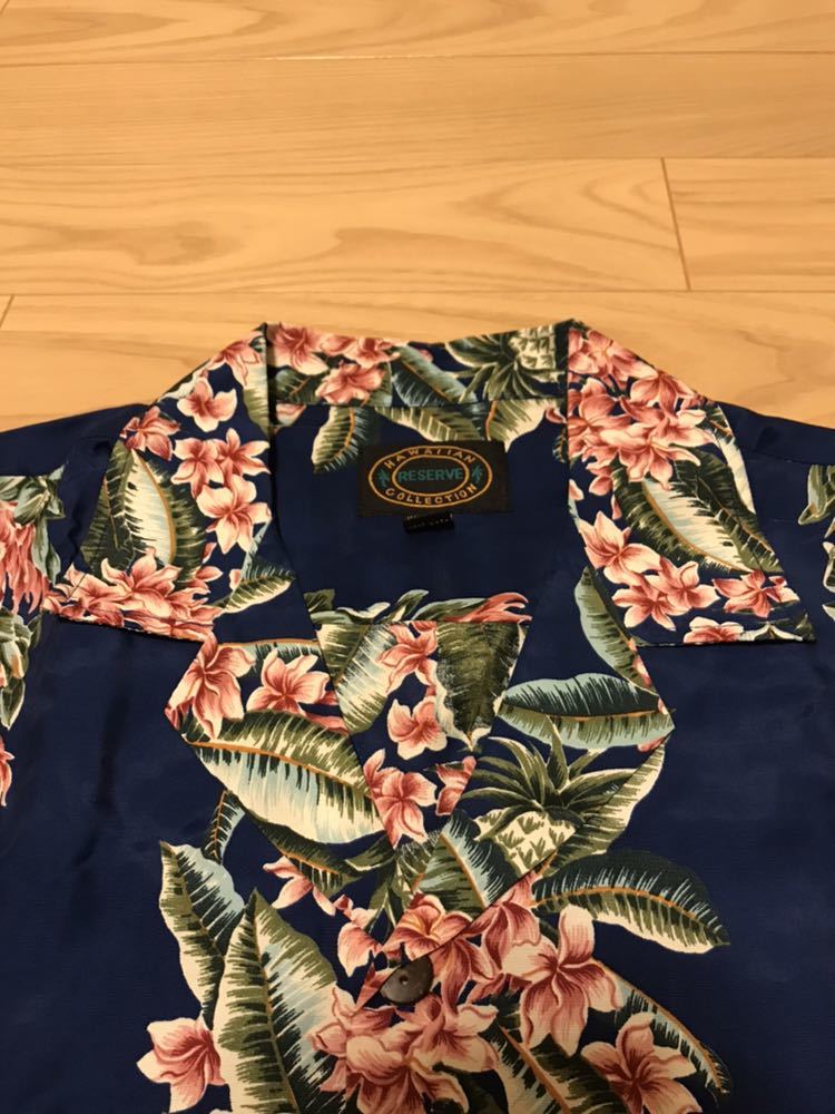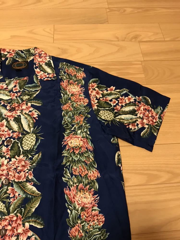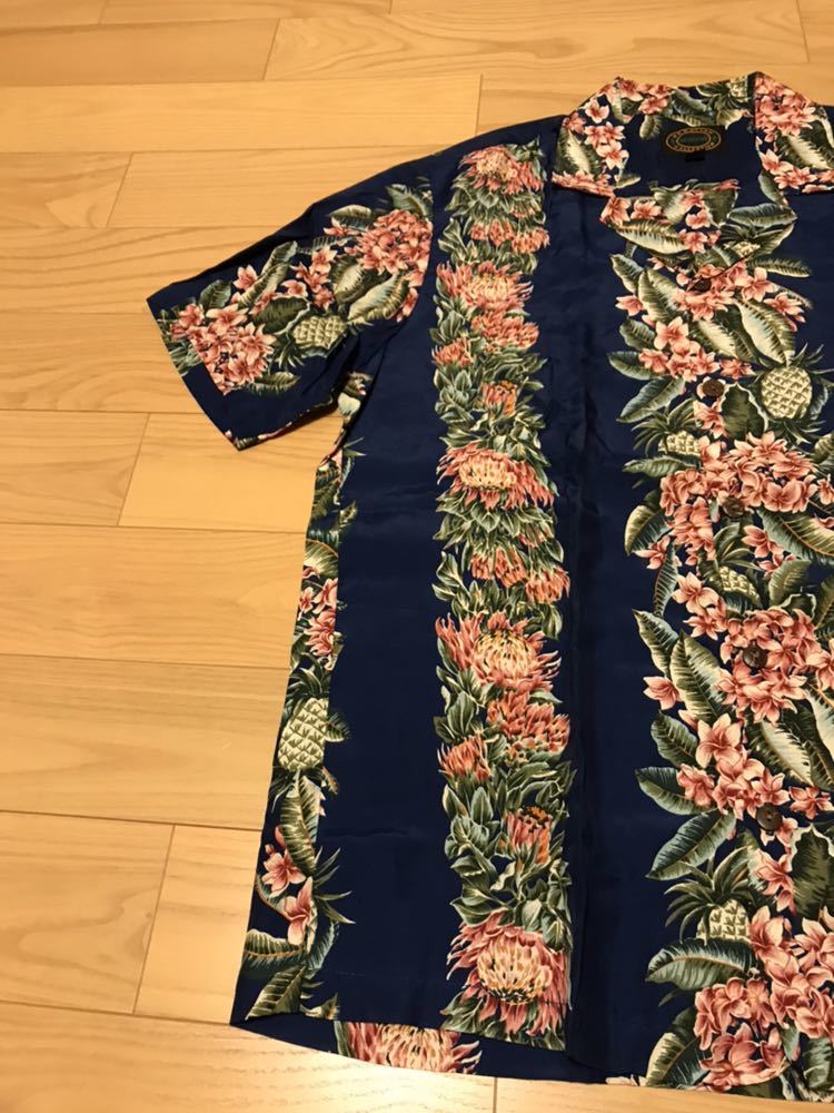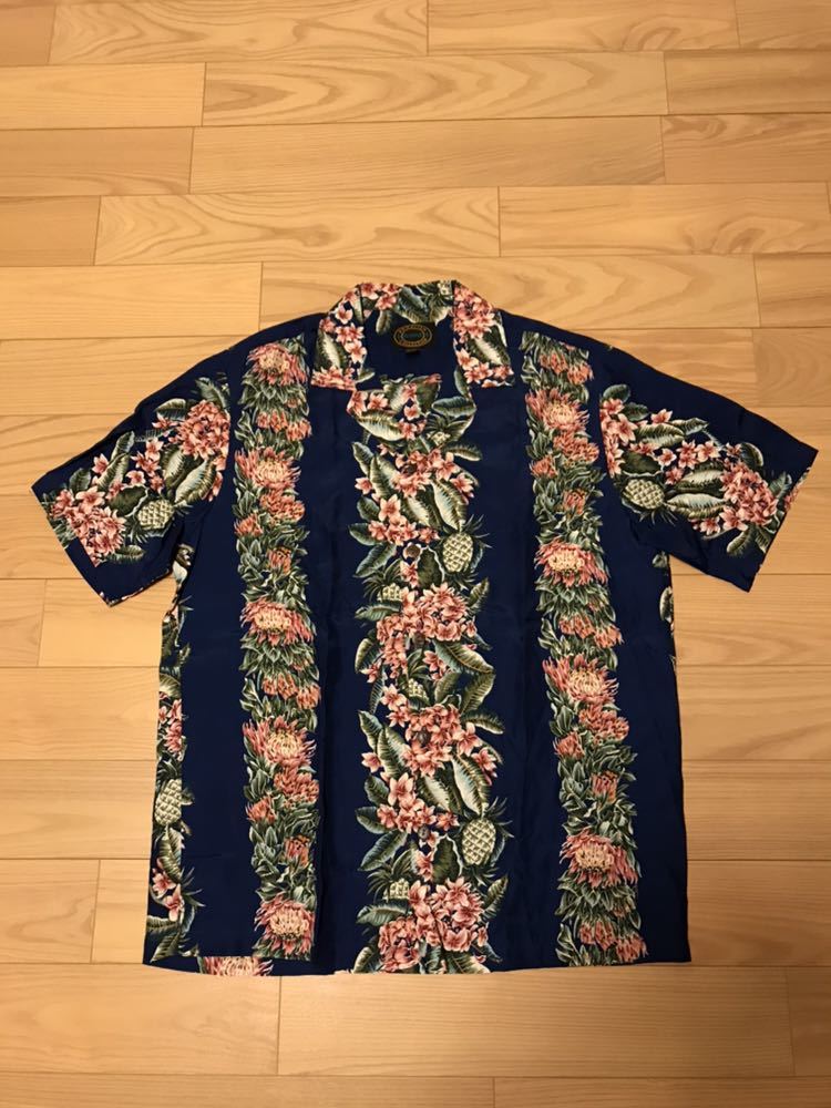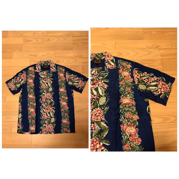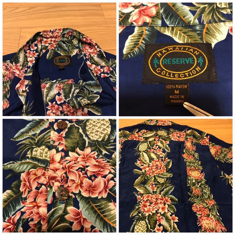 美品☆ハワイ/HAWAII製 RESERVE メンズサイズM大き目 HAWAIIAN COLLECTION 半袖 希少レーヨン アロハシャツ パイナップル&葉っぱ柄ボーダー