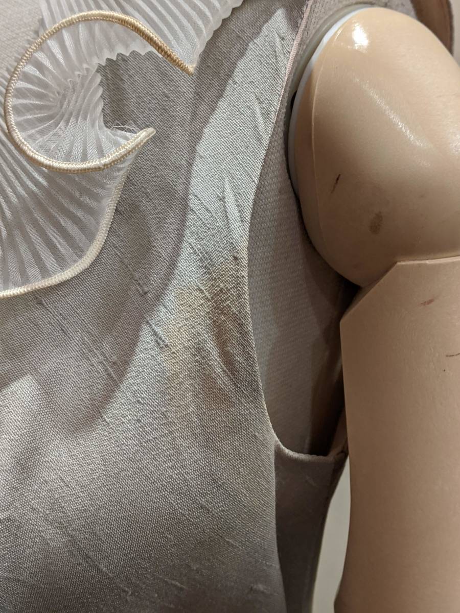 生地自体はしっかりしておりますので、羽織りと重ねるなり、シミが気にならなければまだまだ着て頂けます