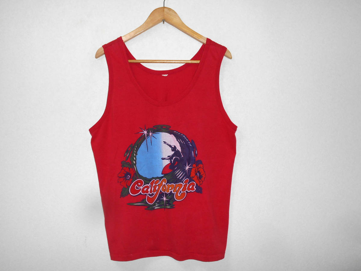ビンテージ☆ サーフ柄プリント タンクトップ ヴィンテージ 赤 サイズ XL です。 素材は綿50、ポリエステル50です。色は赤です。大体80年代ぐらいのビンテージものだと思います。