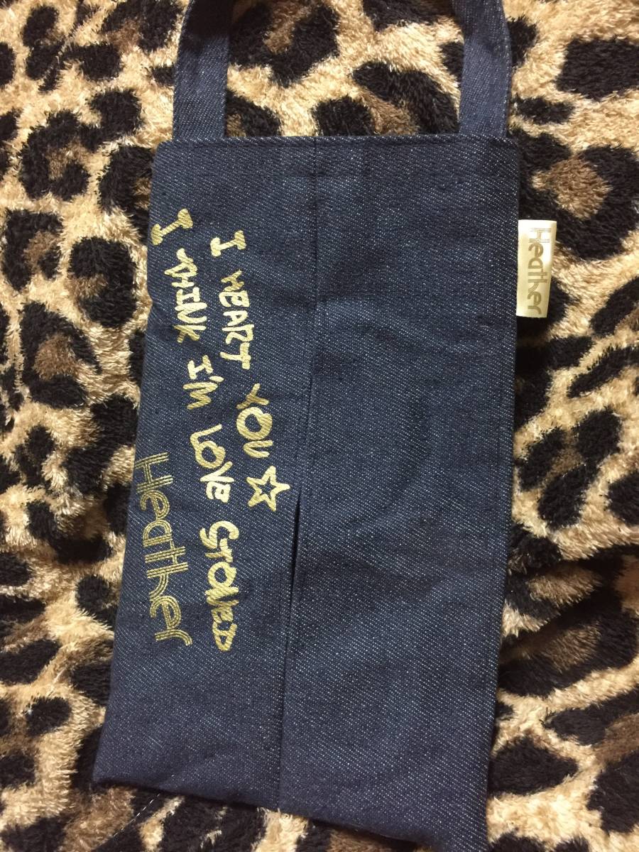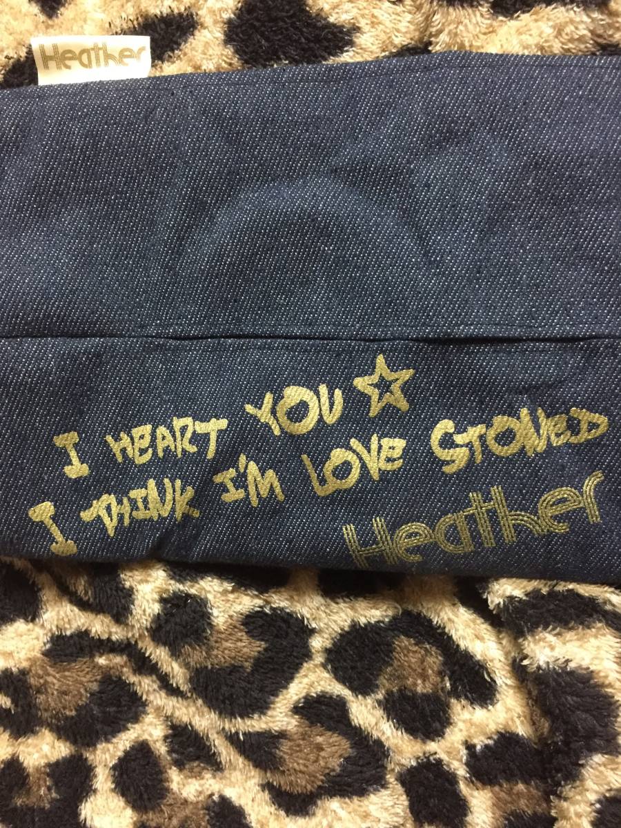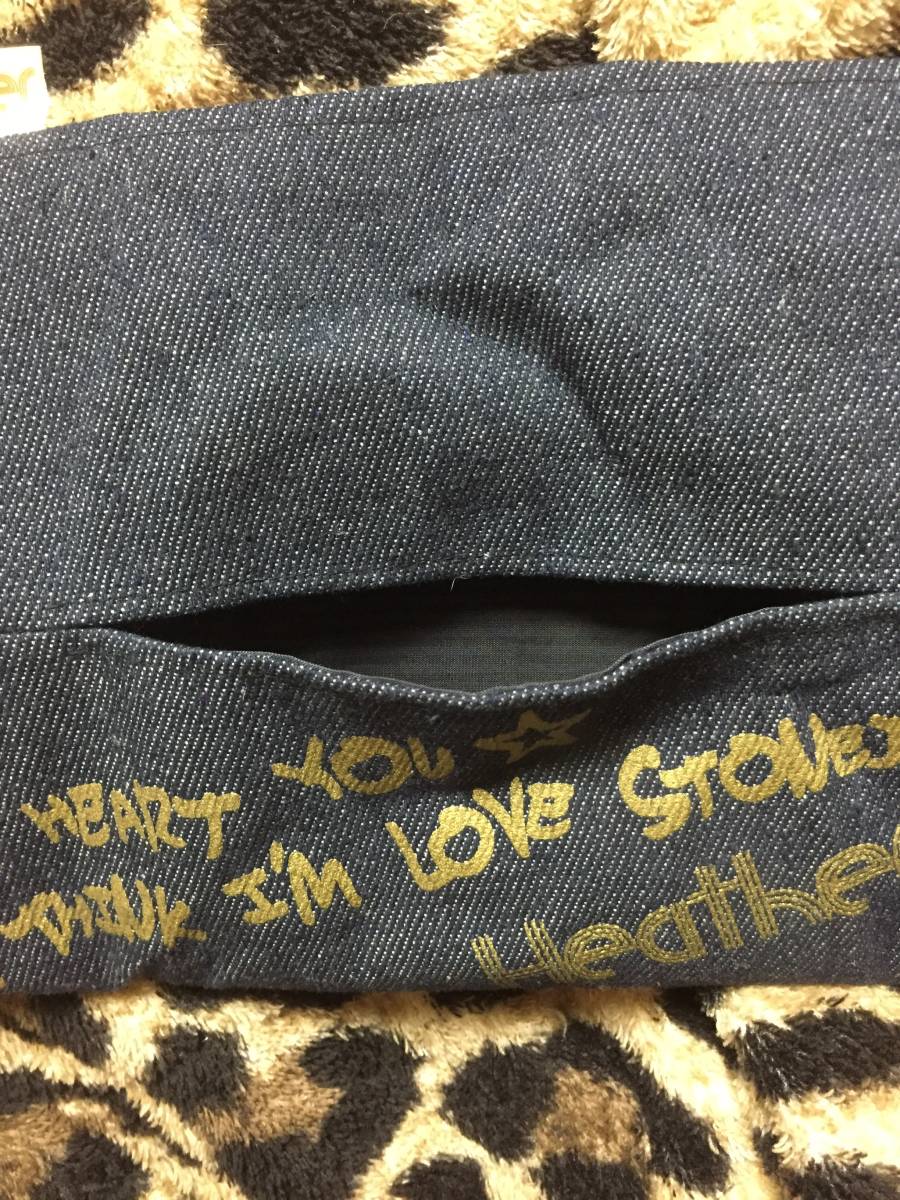 ティッシュカバー正面にゴールドでI HEART YOU ☆I THINK I'M LOVE STONED HEATHERのプリントがあります。