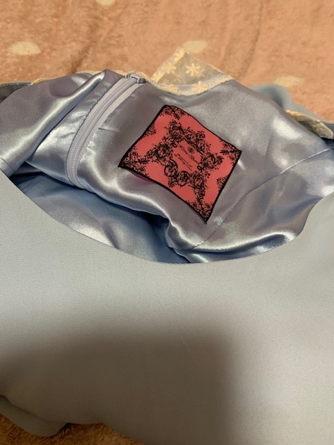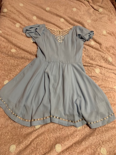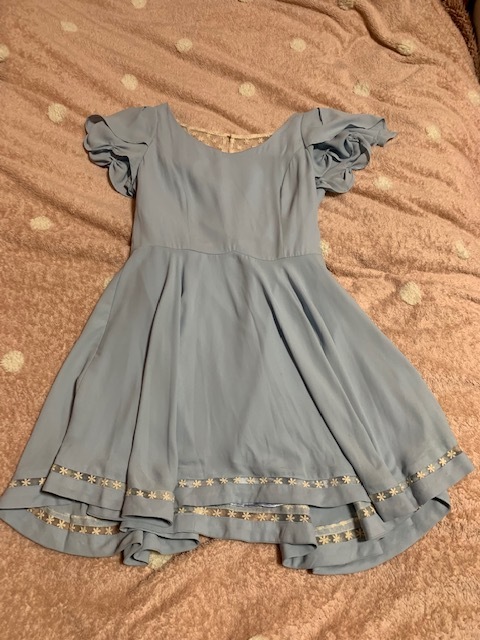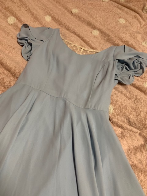 超美品!ハニーバンチ 肩フリル 背中とスカート裾フラワーチュール素材 Aラインフレアシフォン素材ワンピース【ブルー・サイズ0(XS)】です☆