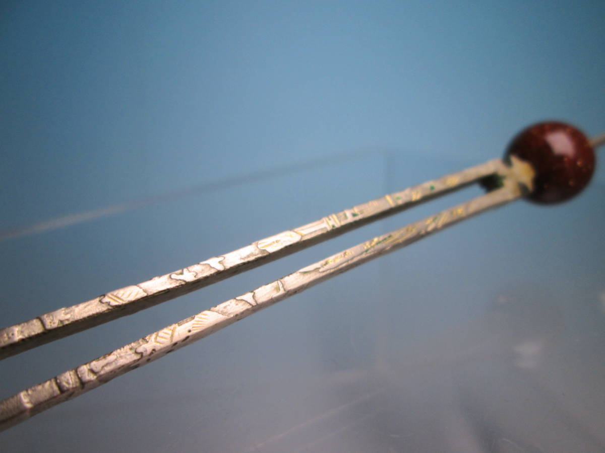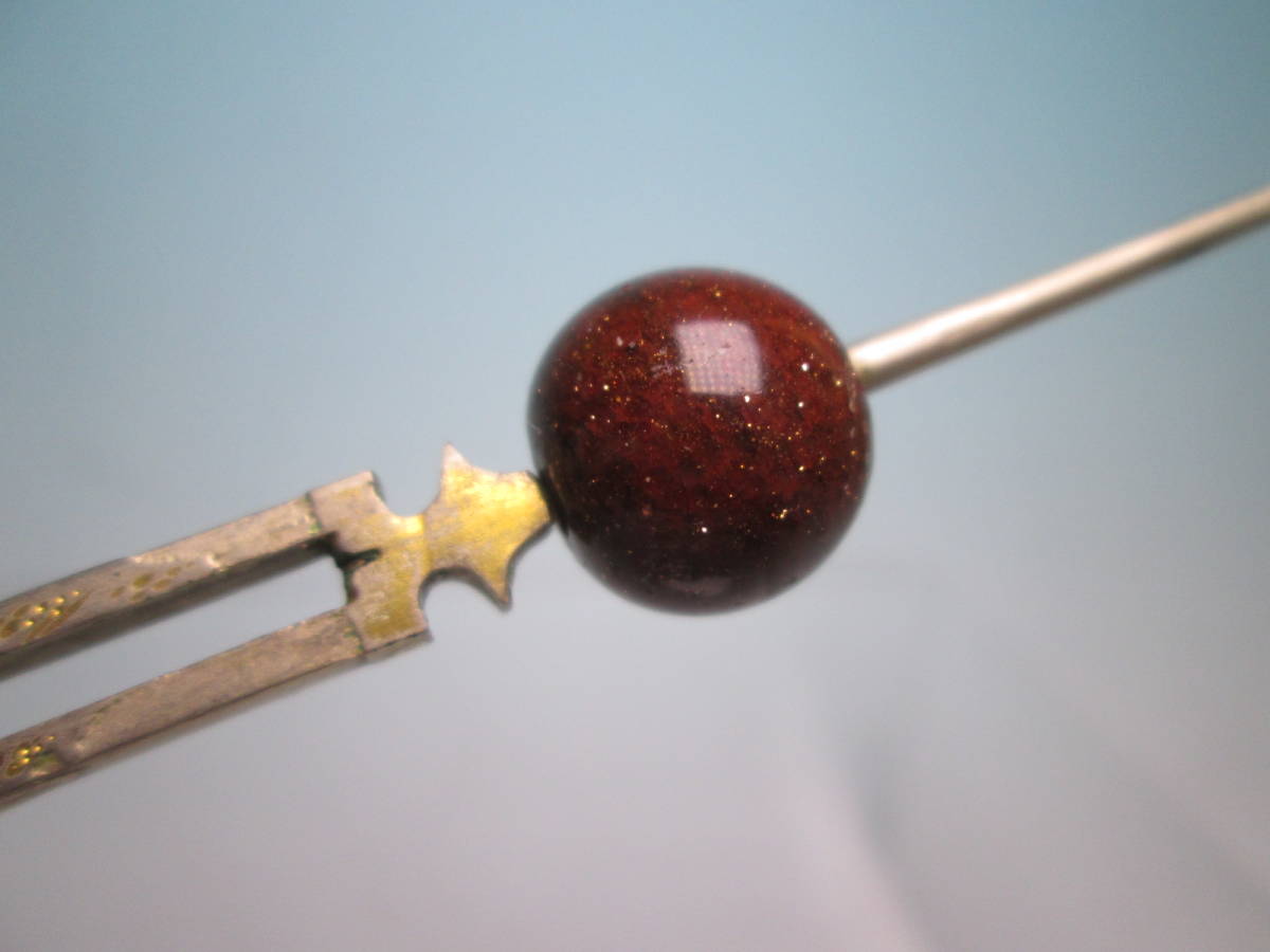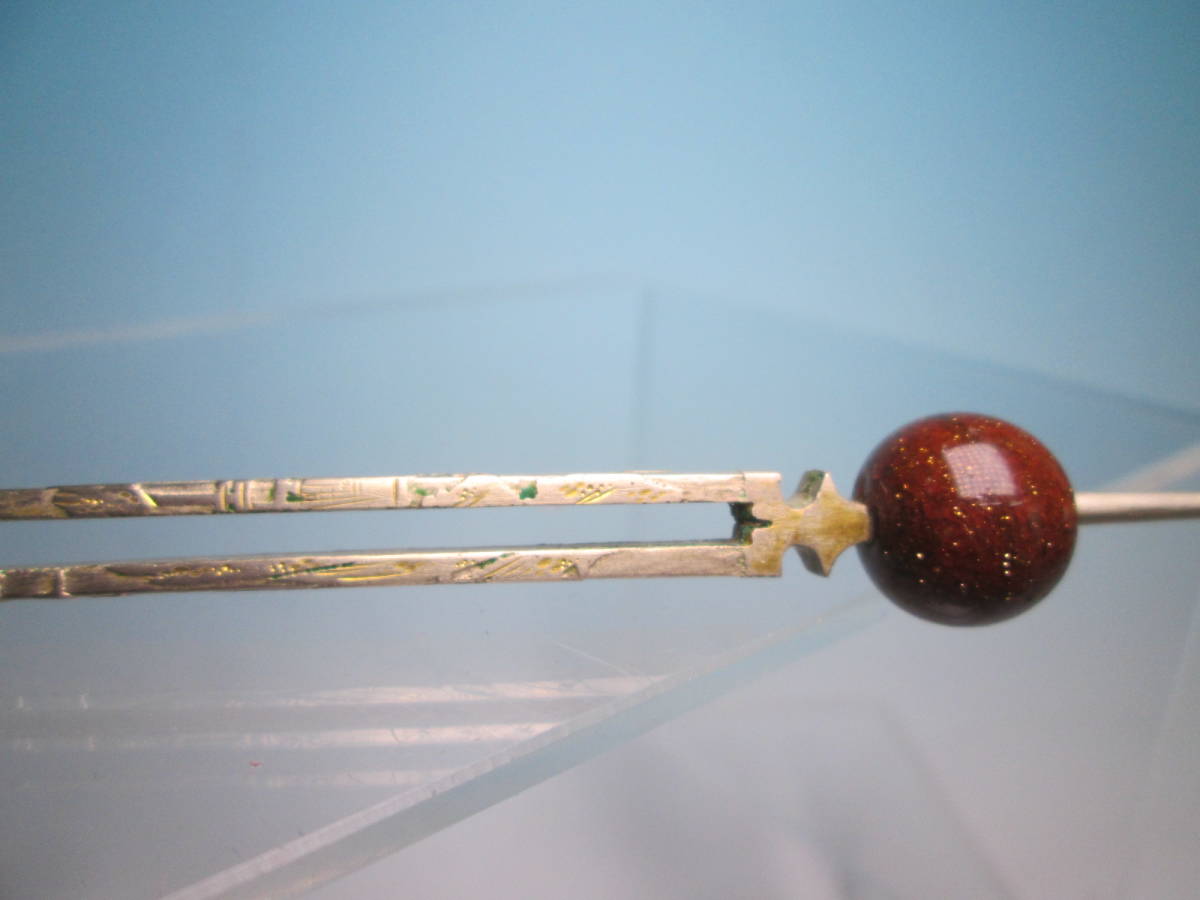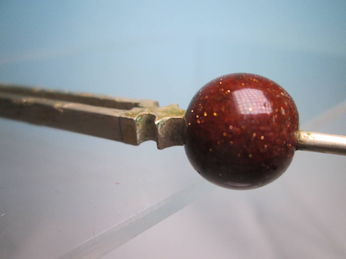 砂金石(ゴールドサンドストーン)玉にかんざしの表裏と両側面に彫金細工された美しい玉かんざしです。