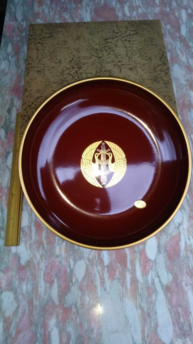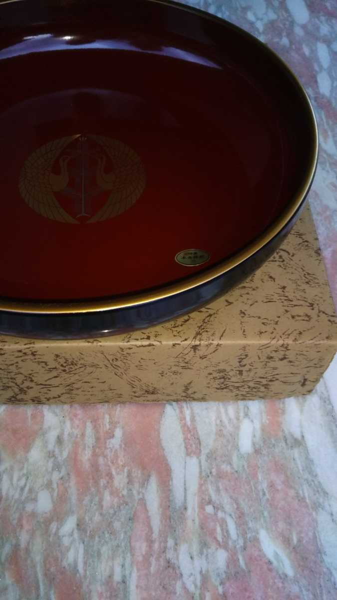 鶴二羽の家紋本金蒔絵菓子鉢(樹脂製) サイズ【直径30㌢高さ6㌢重さ600㌘】 | |||