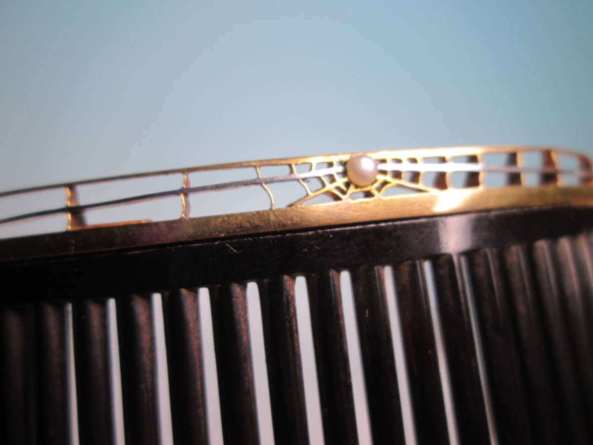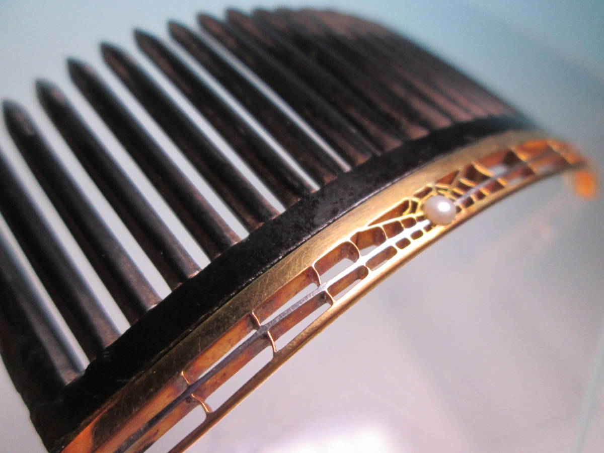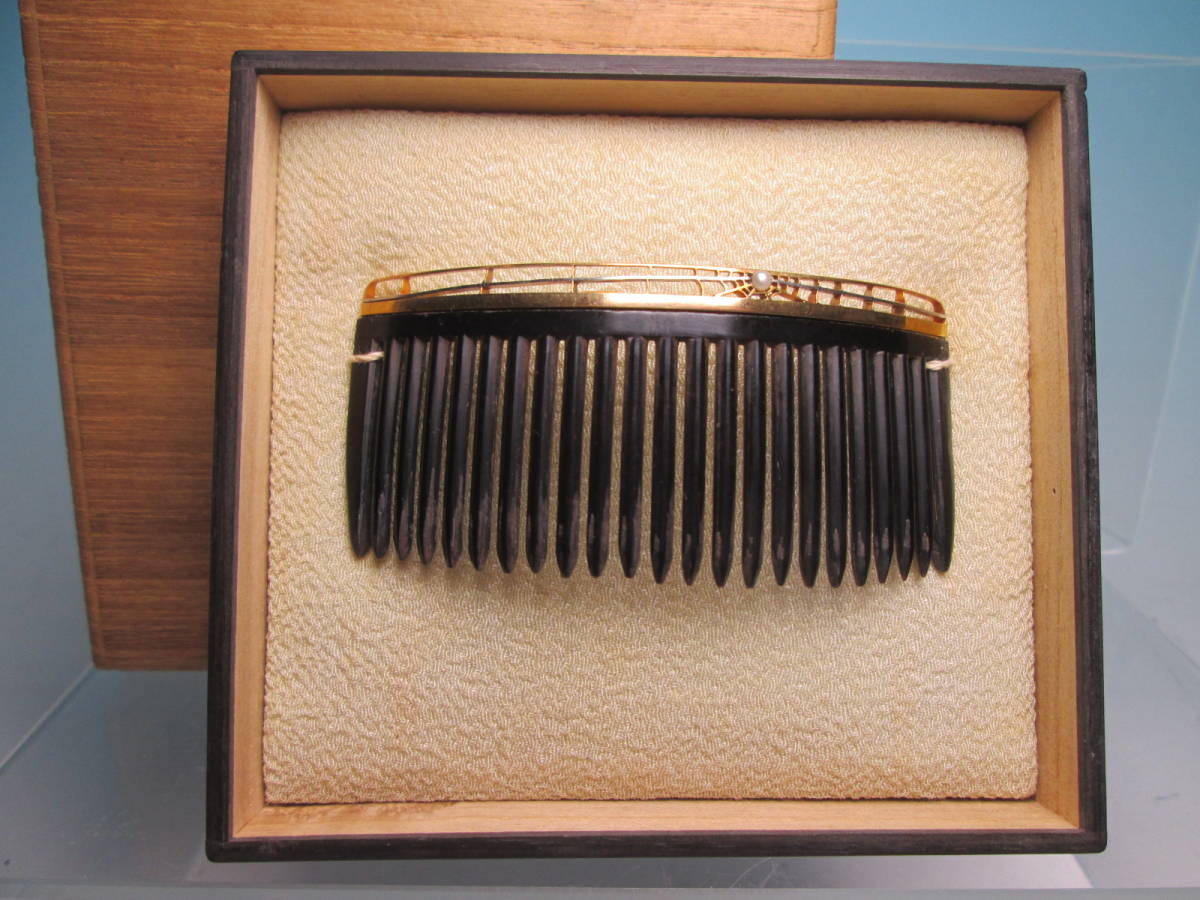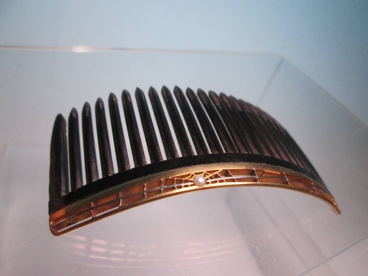 【江月】アンティーク・金彫金細工 蜘蛛の巣透かし文本真珠飾りの櫛 木箱付